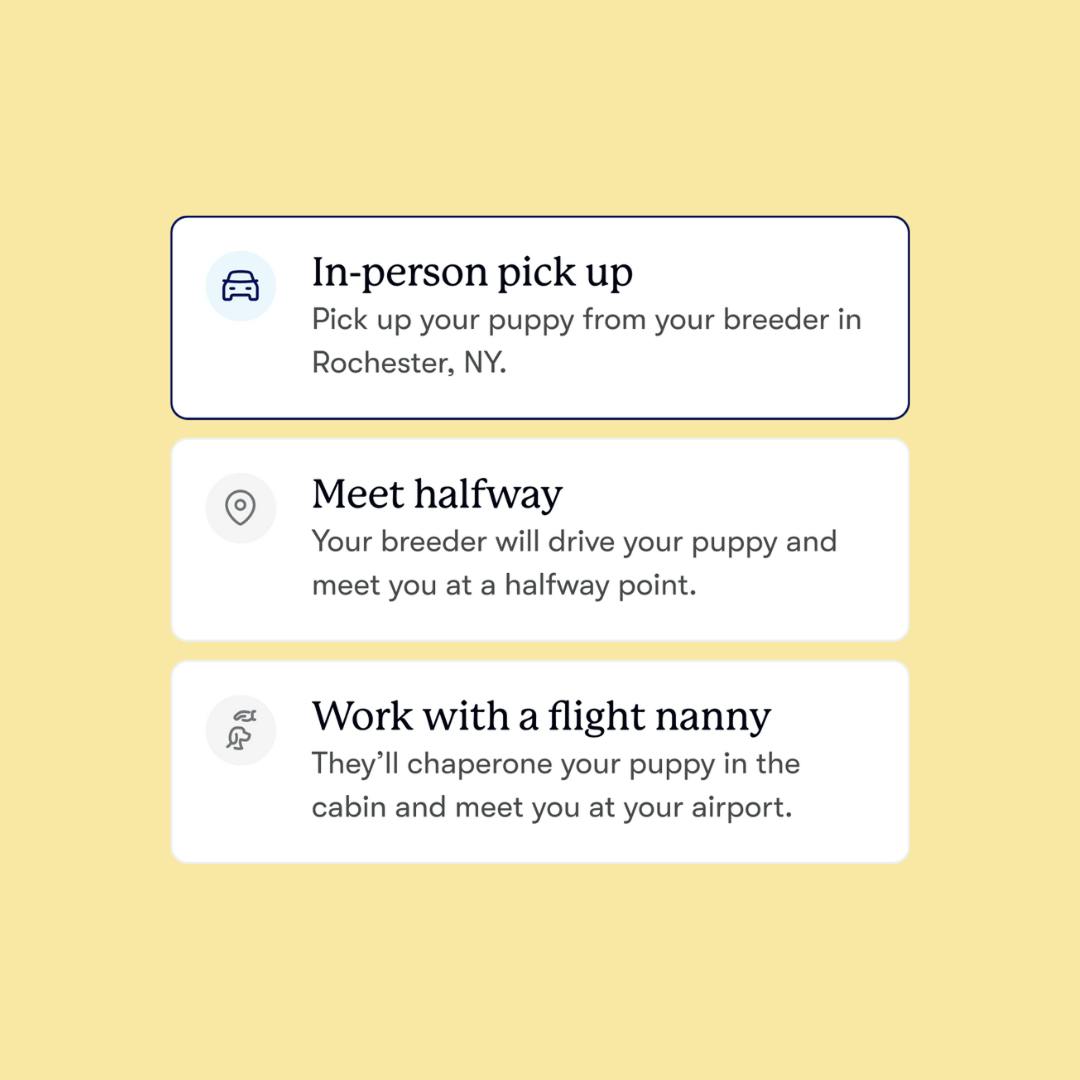 It’s time to hit the road! Whether you're meeting a flight nanny at the airport, driving to your breeder’s home, or coordinating a meetup, pick-up day is often spent in transit. It's an exciting day filled with anticipation, and your breeder will make sure your puppy is ready for the journey home. It might be helpful to start puppy-proofing your house before you bring home your new best friend.