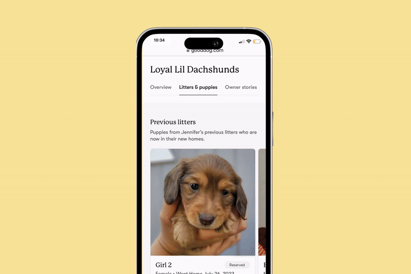 When you spot a puppy or breeder you’re interested in, click their card to learn more. You’ll find details about the puppy, the breeder’s program, parent dogs, health testing, transportation options, and reviews from Good Dog owners.