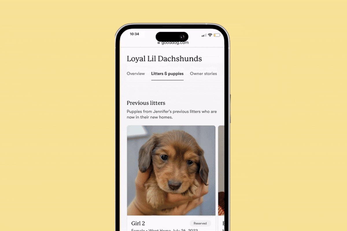 Explore our nationwide network of trusted breeders, shelters, and rescues who meet our standards. You can filter by breed, color, gender, health testing, and location to find your match. With the Good Dog app, it’s easy to take your search with you, get real-time updates, and message breeders directly in one place.
