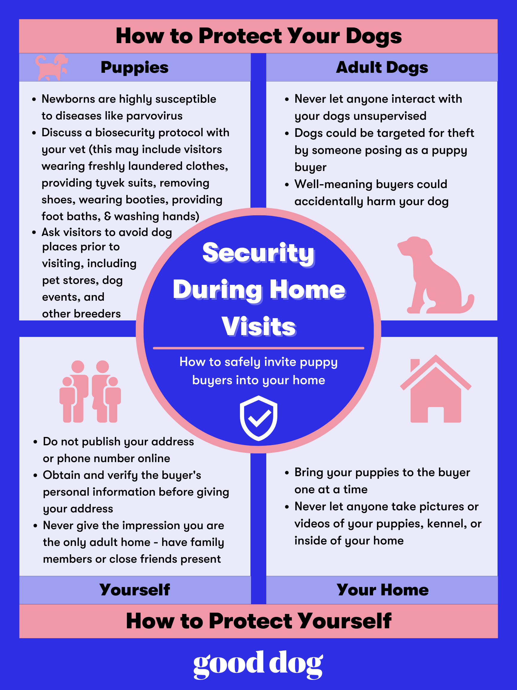 The home visit is an exciting part of the puppy buying process. Learn how to keep your dogs and yourself safe when inviting prospective buyers in your home.