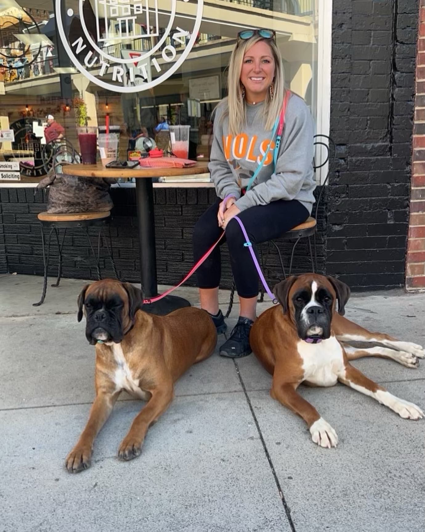 Fawn puppy boxer running beside its owner