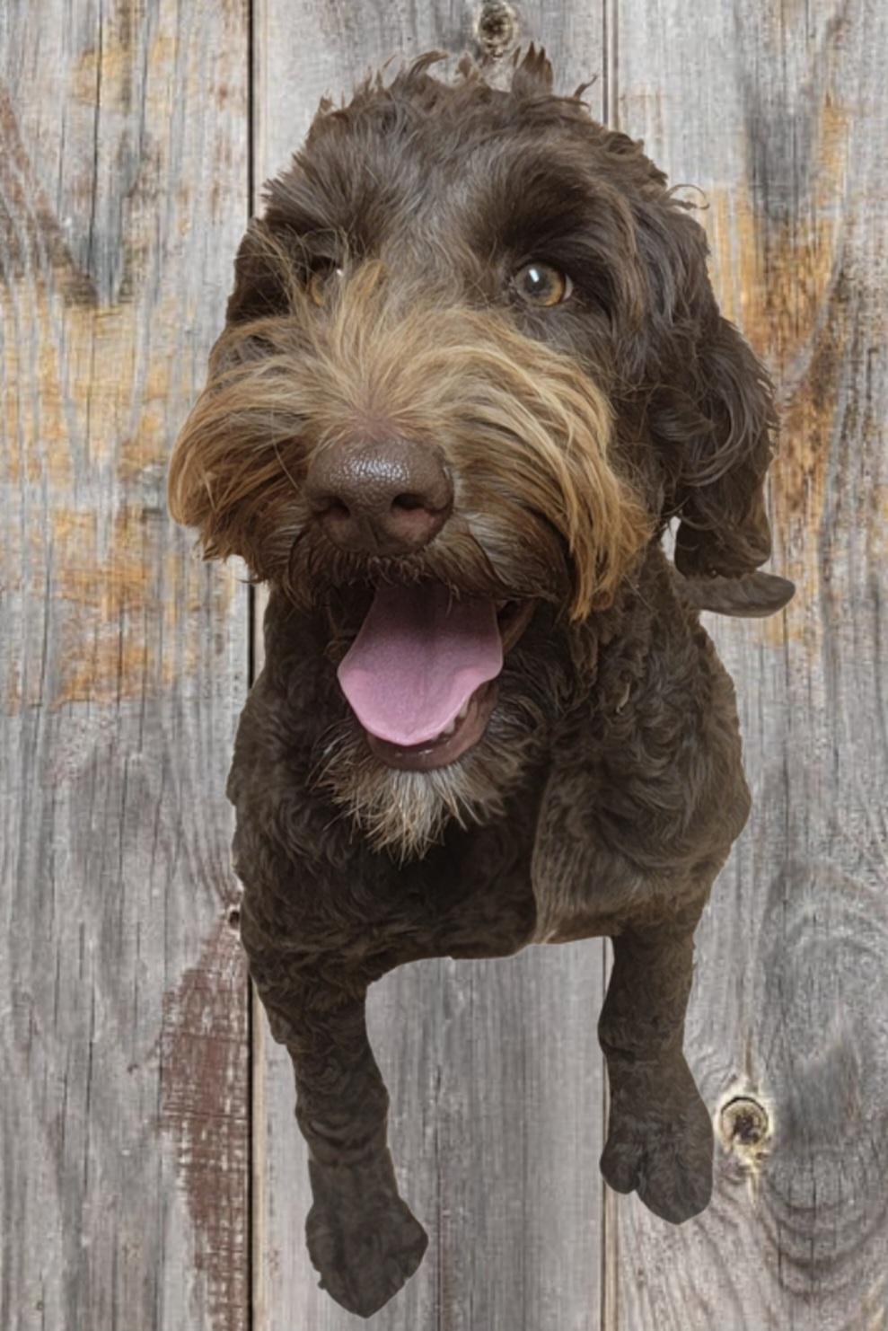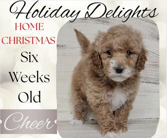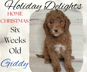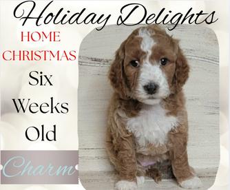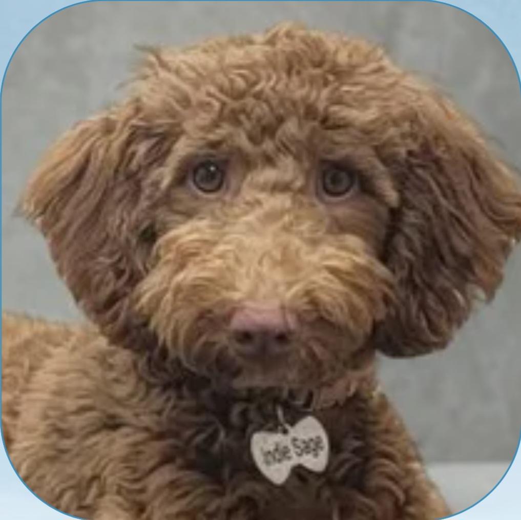 Indie is our fun loving old soul. She is human focused and such a snuggle bug. Her favorite person is her daddy and she will stare straight into your soul with her loving eyes. She has soft, wavy curls that are very manageable. She is dark red with a white spot on her chest in the shape of a heart.