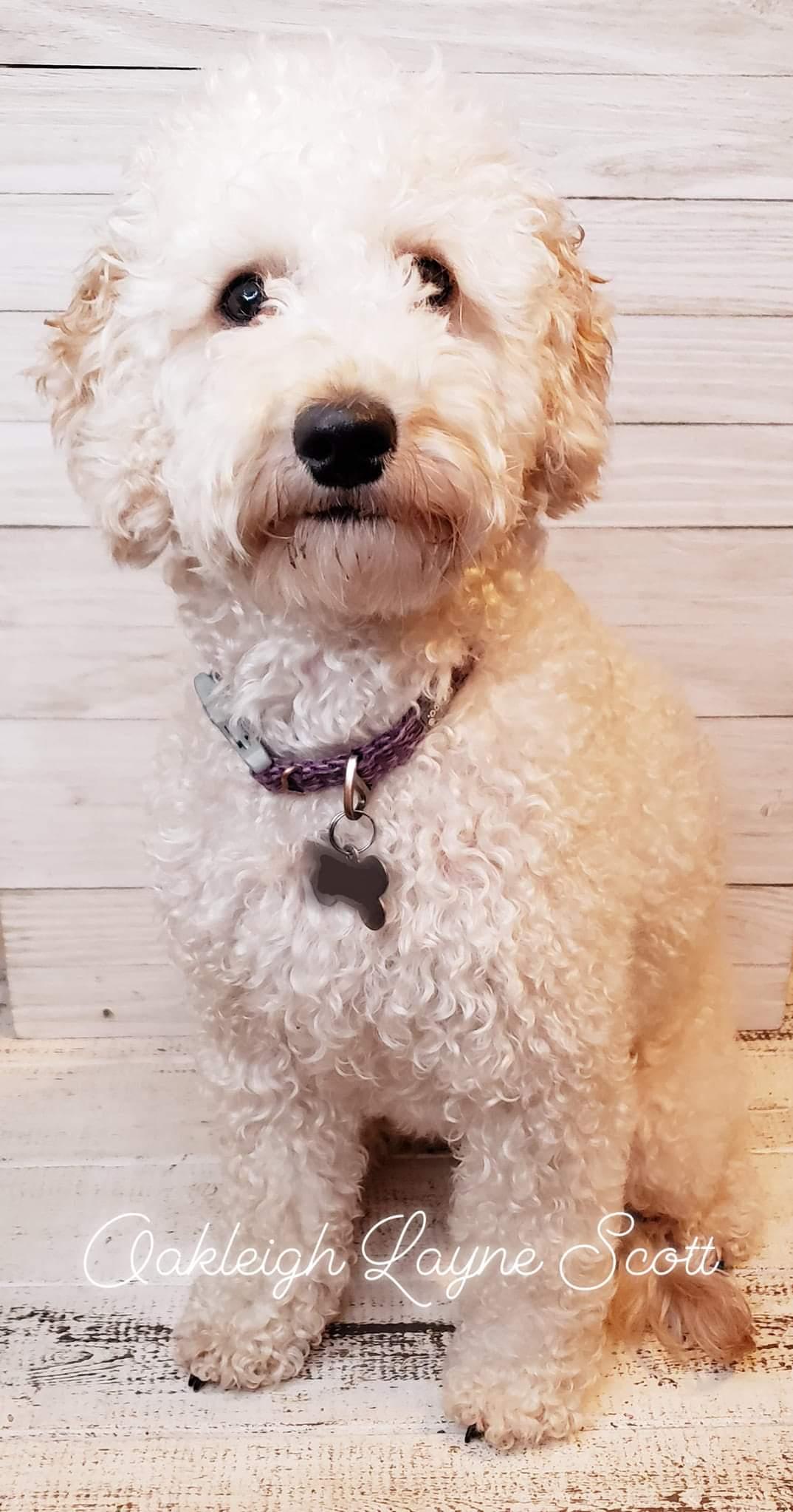 Oakleigh is our 16 lb apricot F1b mini Goldendoodle. She has good/normal OFAs and is CDPA clear. She is fun loving and such a snuggle bug, too. Her favorite thing to do is to play fetch. And she also enjoys a good game of hide and seek.