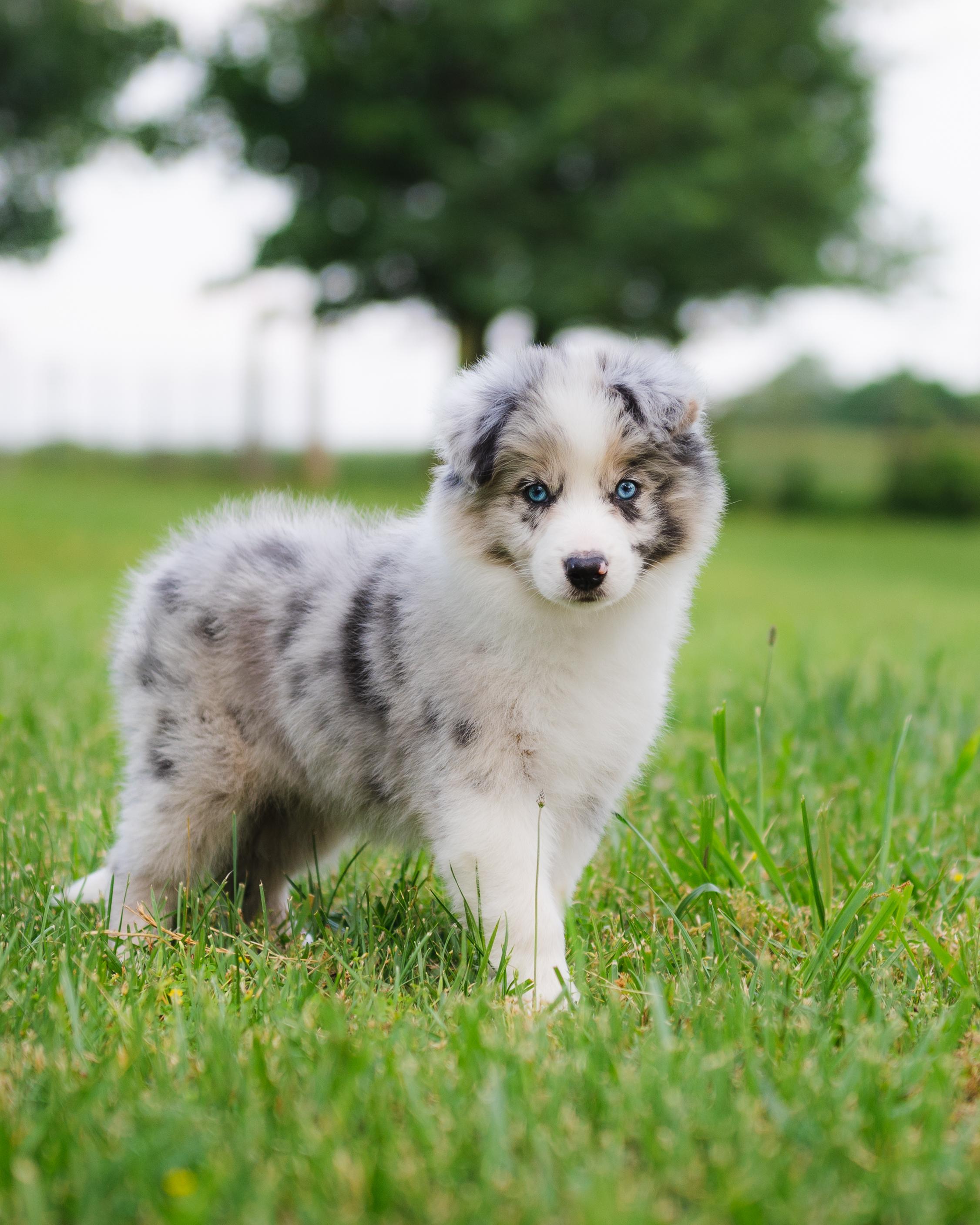 Our Border Collie puppies include blue merle, red merle, blue, gold, lilac, white and blue, white and blue merle, white and red, white and red merle, and white and gold. Maremma Sheepdog puppies are white. Colors will vary depending on the parent dogs.