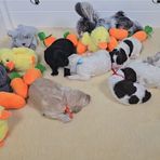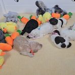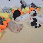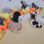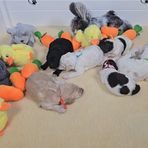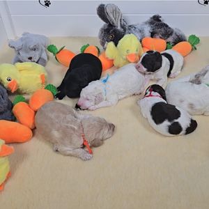Our City Litter Bordoodle puppies are growing and thriving! Though their eyes and ears weren’t open yet in these photos, their sense of smell was already active, and we introduced them to various novelty items in the whelping box. This early exposure plays a vital role in shaping their confidence, adaptability, and overall development. 🐰🥕🐥