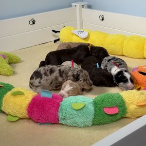 Take a look at our adorable Bordoodle puppies from the Enchanted Desert Litter as they snuggle together in their whelping box, surrounded by a colorful caterpillar, a cheerful sun, a cozy moon, and a buzzing bee plushie. 🐛🌞🌙🐝