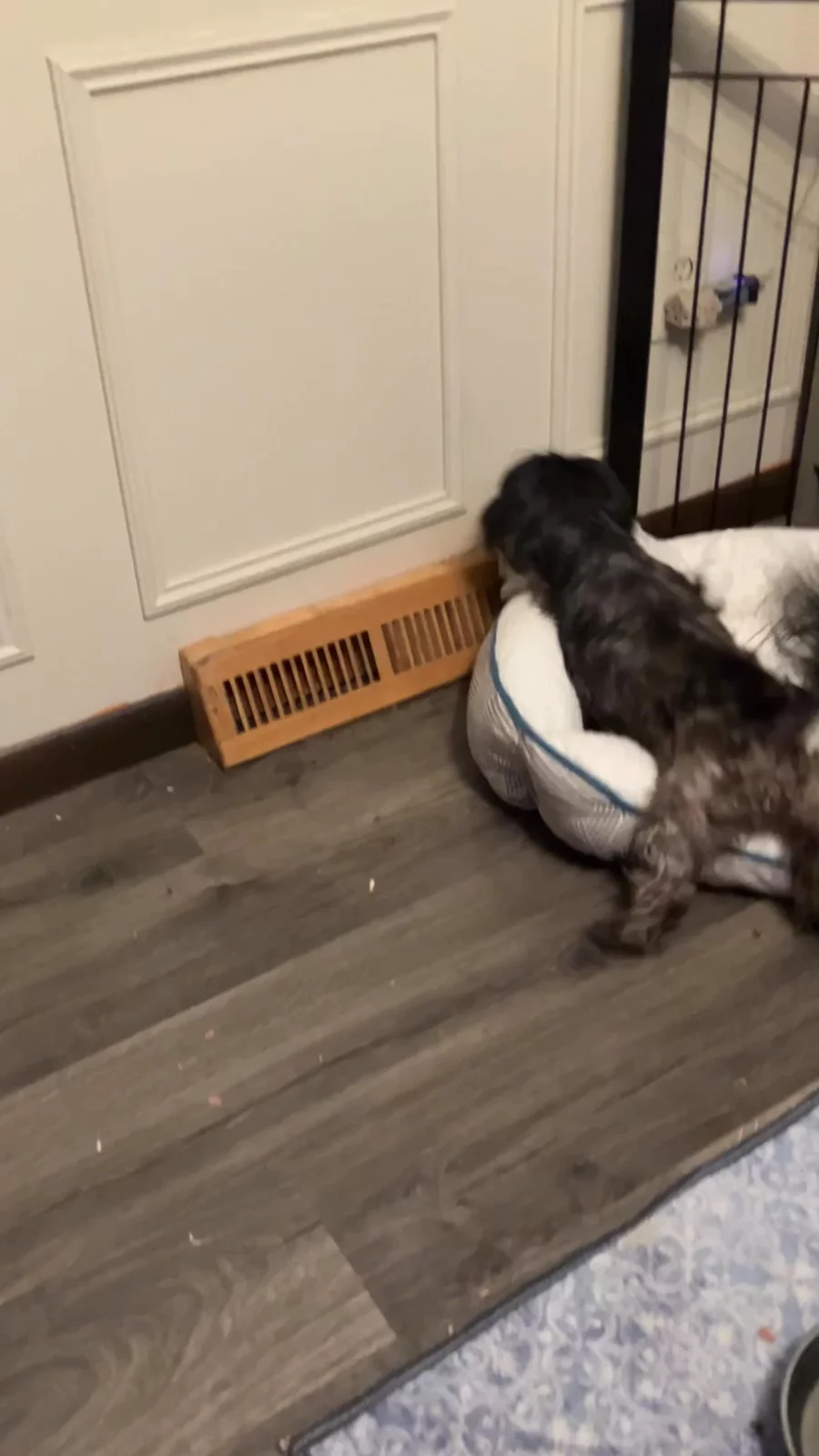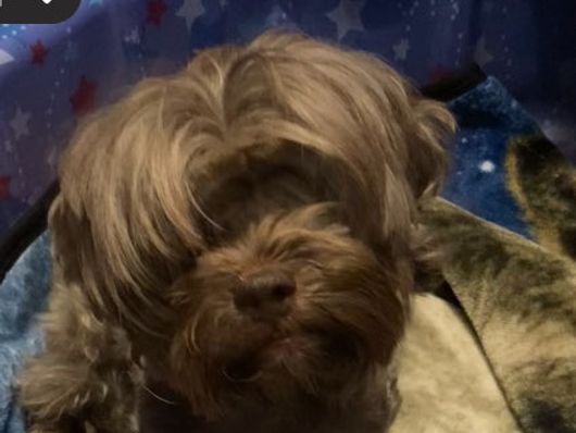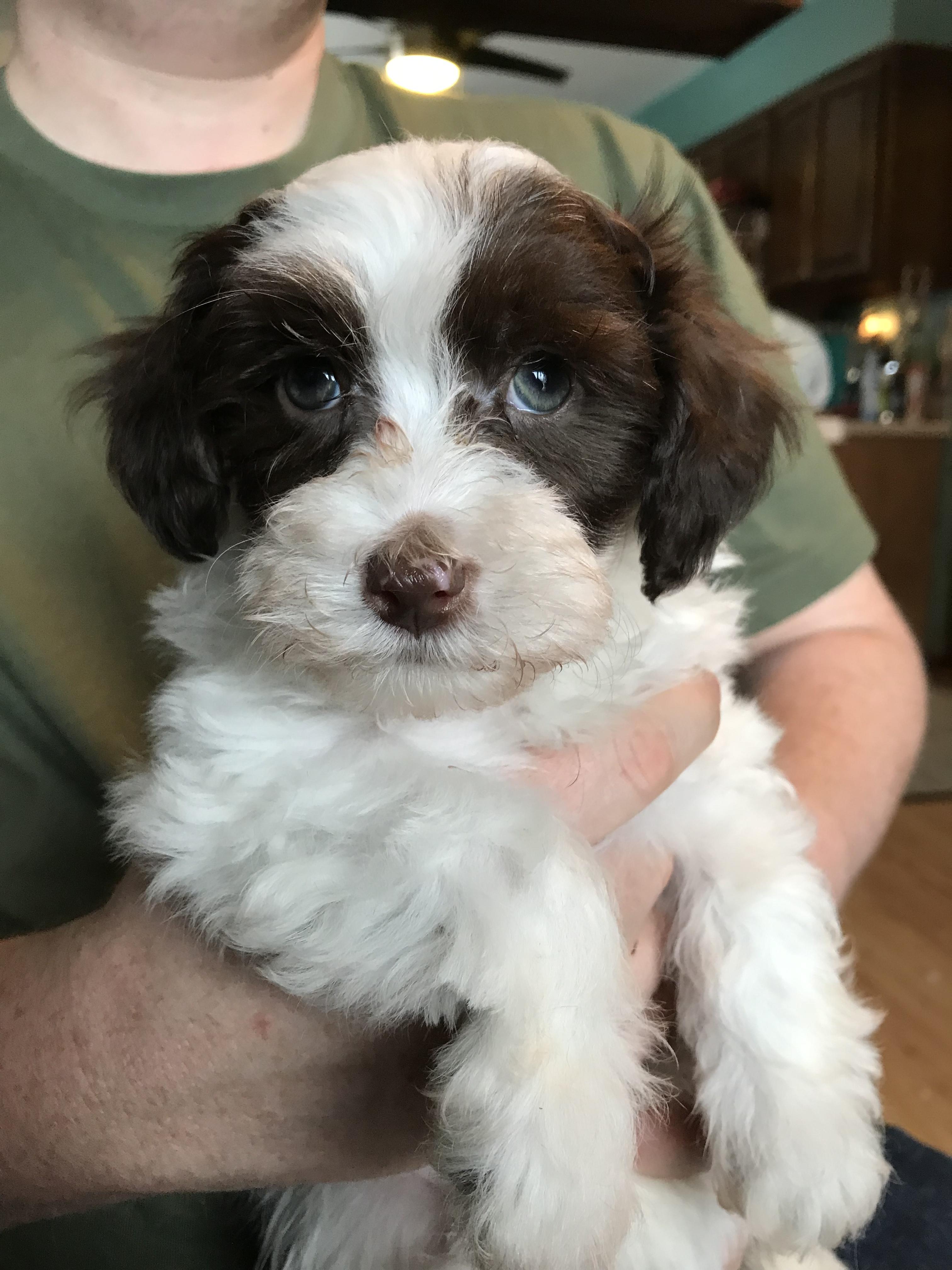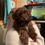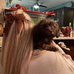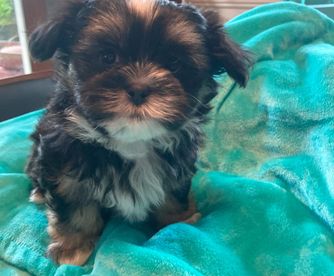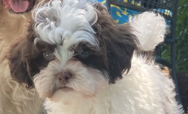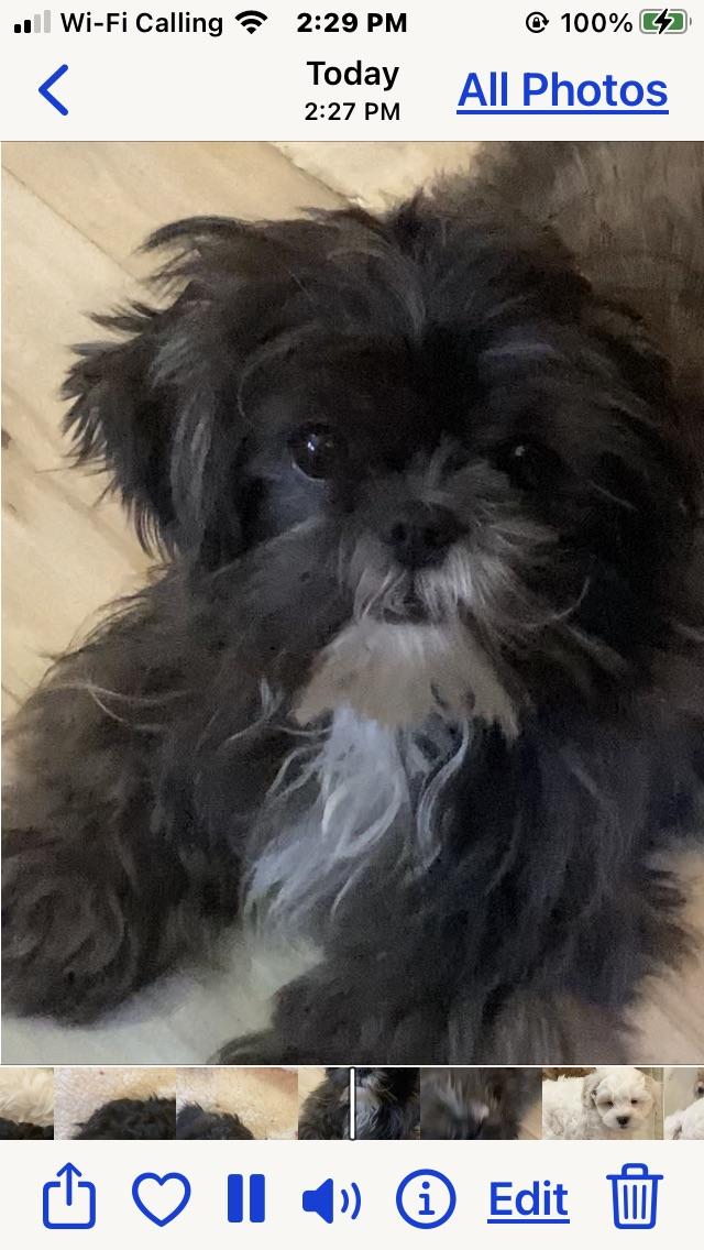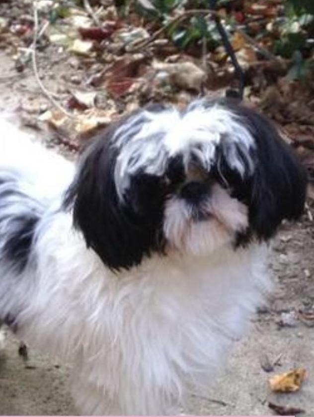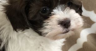 Blue ShihTzu with black coat and red undertones and some white. Her parents are Moses and Cami (on our page)