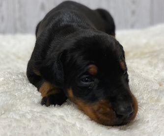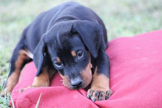 32 Farms reports to performing the health tests below on their breeding dogs. Ask your breeder about the tests performed on the parents of your litter. Learn more about health testing for Doberman Pinschers.