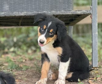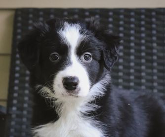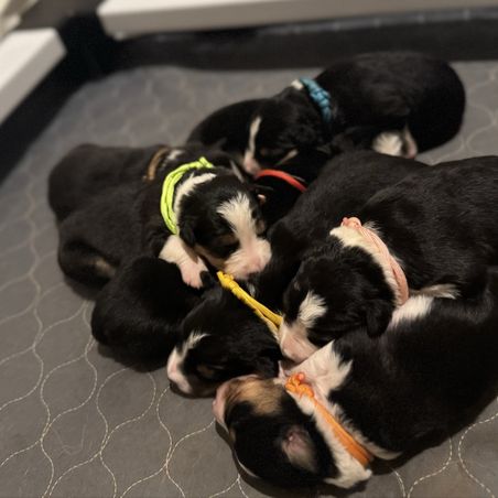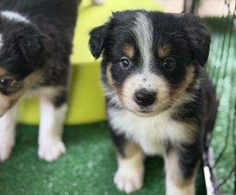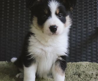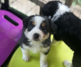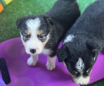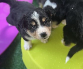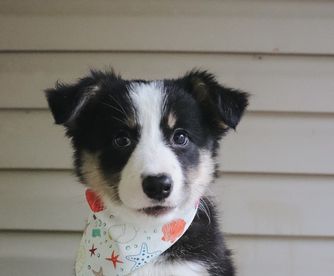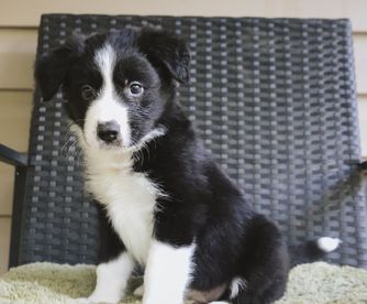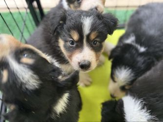 Our Cardigan Welsh Corgi puppies are black and white. Border Collie puppies include tri-color, black and white, blue merle, red merle, white and blue, and white and red. Colors will vary depending on the parent dogs.