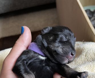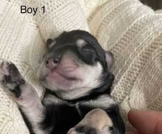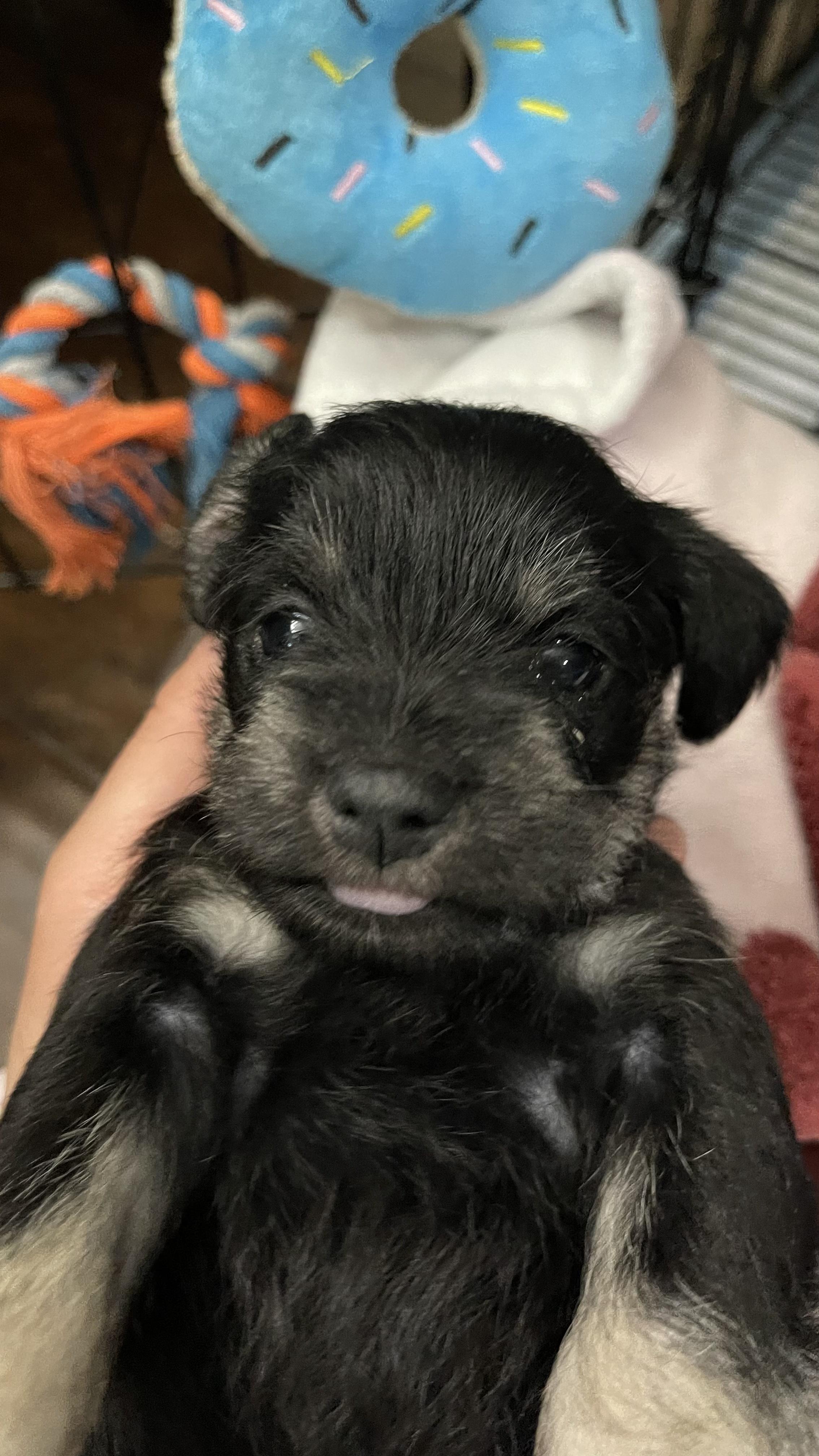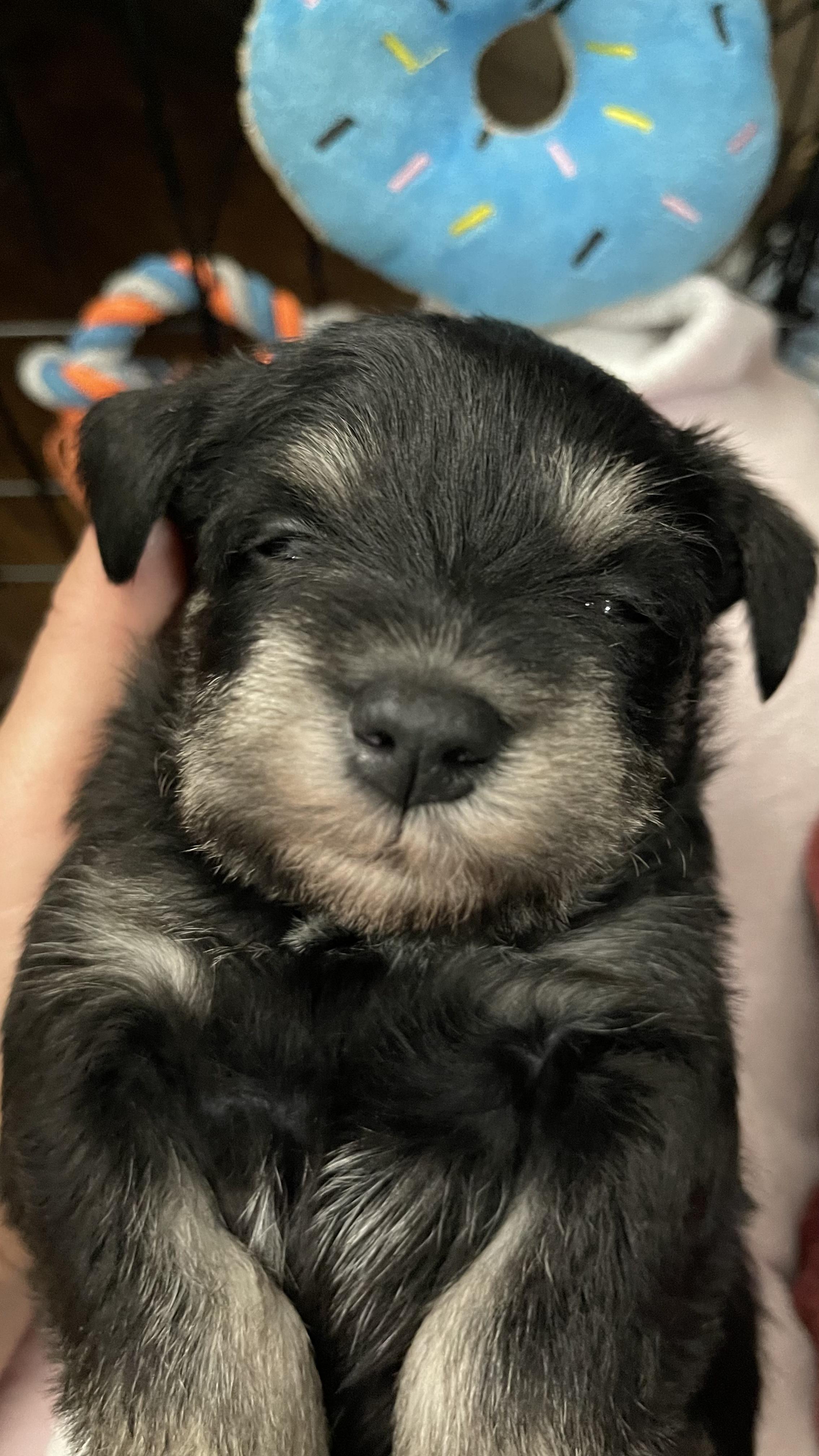 Our puppies include salt and pepper, black and silver, and black. Colors will vary depending on the parent dogs.