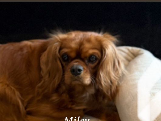 Miley enjoys the fresh air of the outdoors and sunshine. She is just as happy cuddled up with a good movie or a bone on a comfortable lap couch or bed. Dark beautiful red