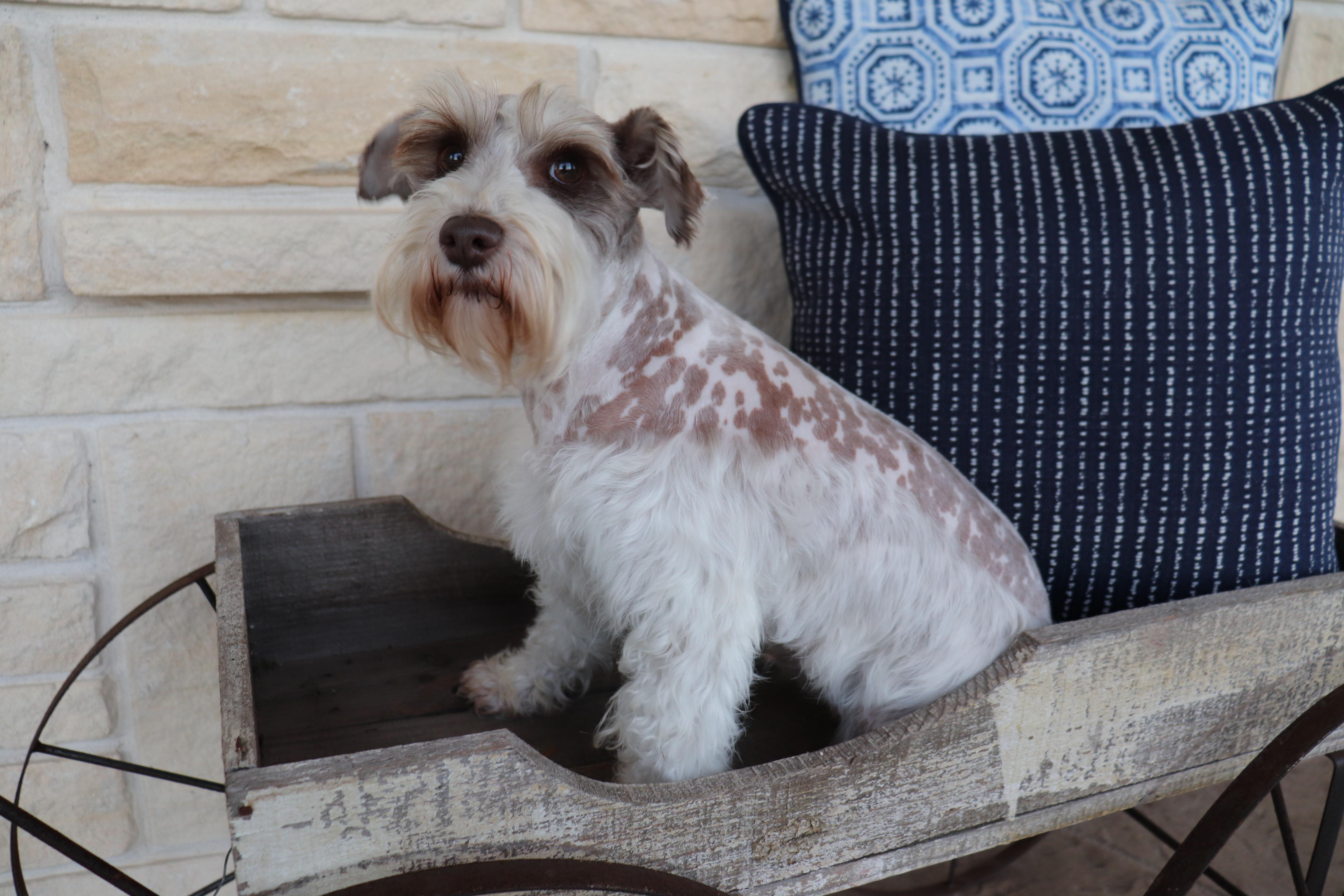 Stetson is a male Miniature Schnauzer. Carefully selected as a great representative of his breed, Courtney decided to make him part of their program. Courtney has passed Good Dog’s screening process, which involved a review of their breeding practices, environment, and the mental and physical health of their dogs.