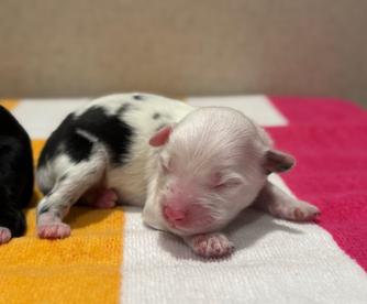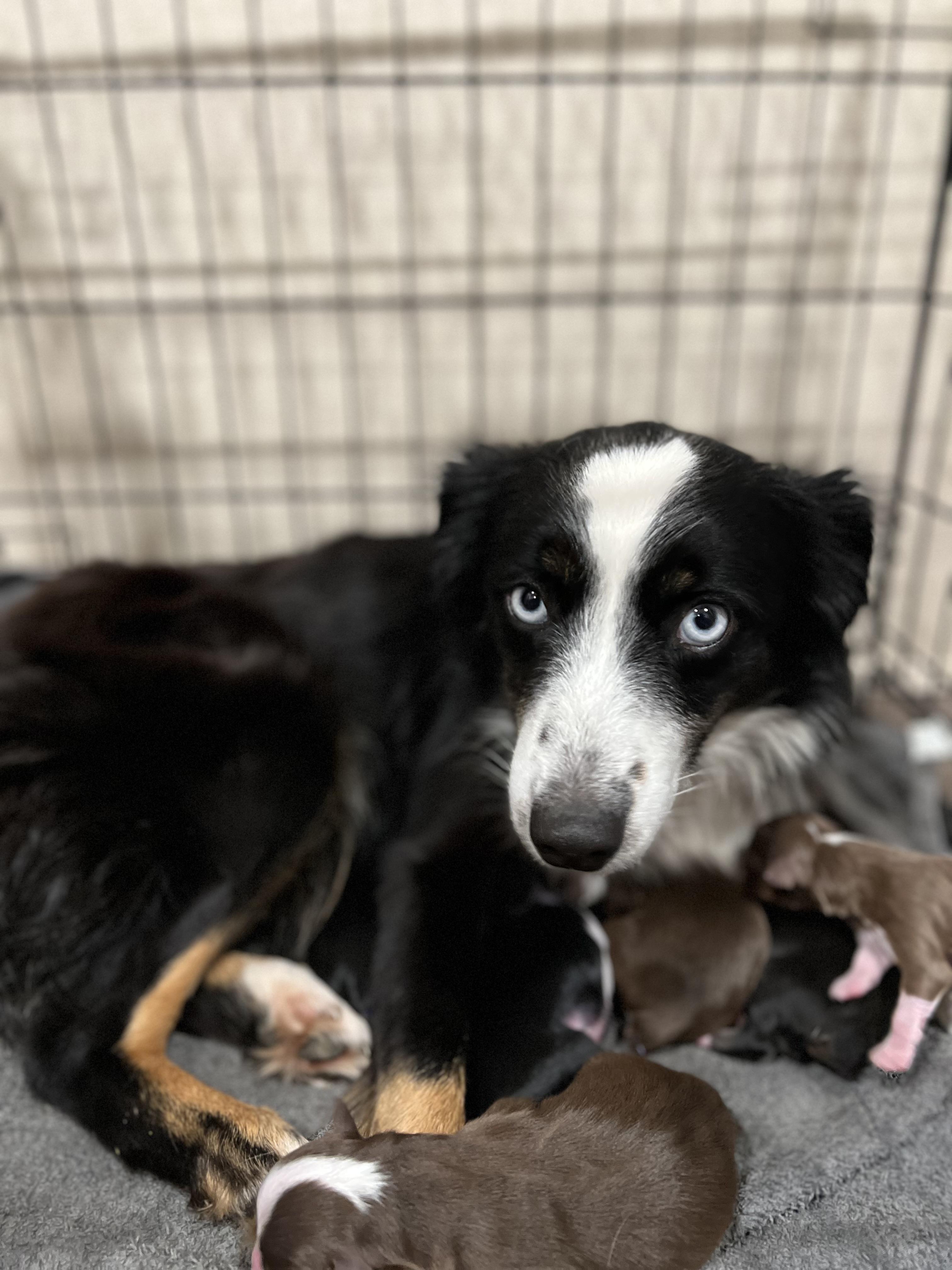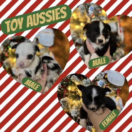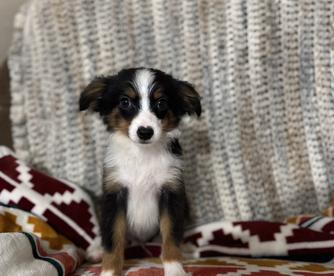 Our Toy Australian Shepherd puppies include black & white, black tri, blue merle, and red tri. Miniature Australian Shepherd puppies include black tri and red tri. Colors will vary depending on the parent dogs.