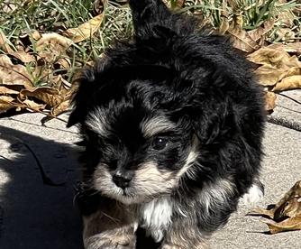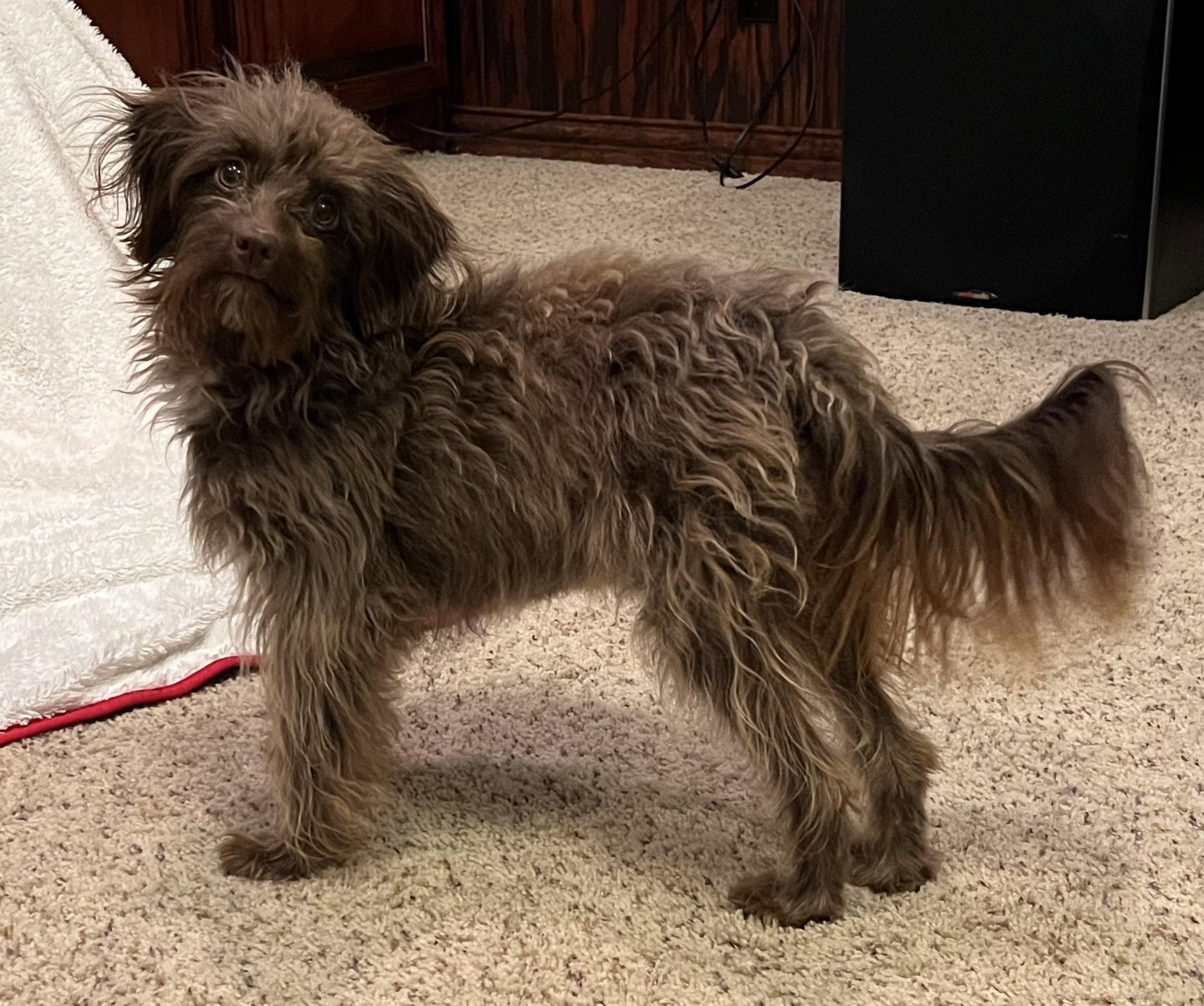 Poppy is a CKC registered chocolate Aussiedoodle with just a tiny patch of white on her chest. She loves to run and play, and never meets a stranger.