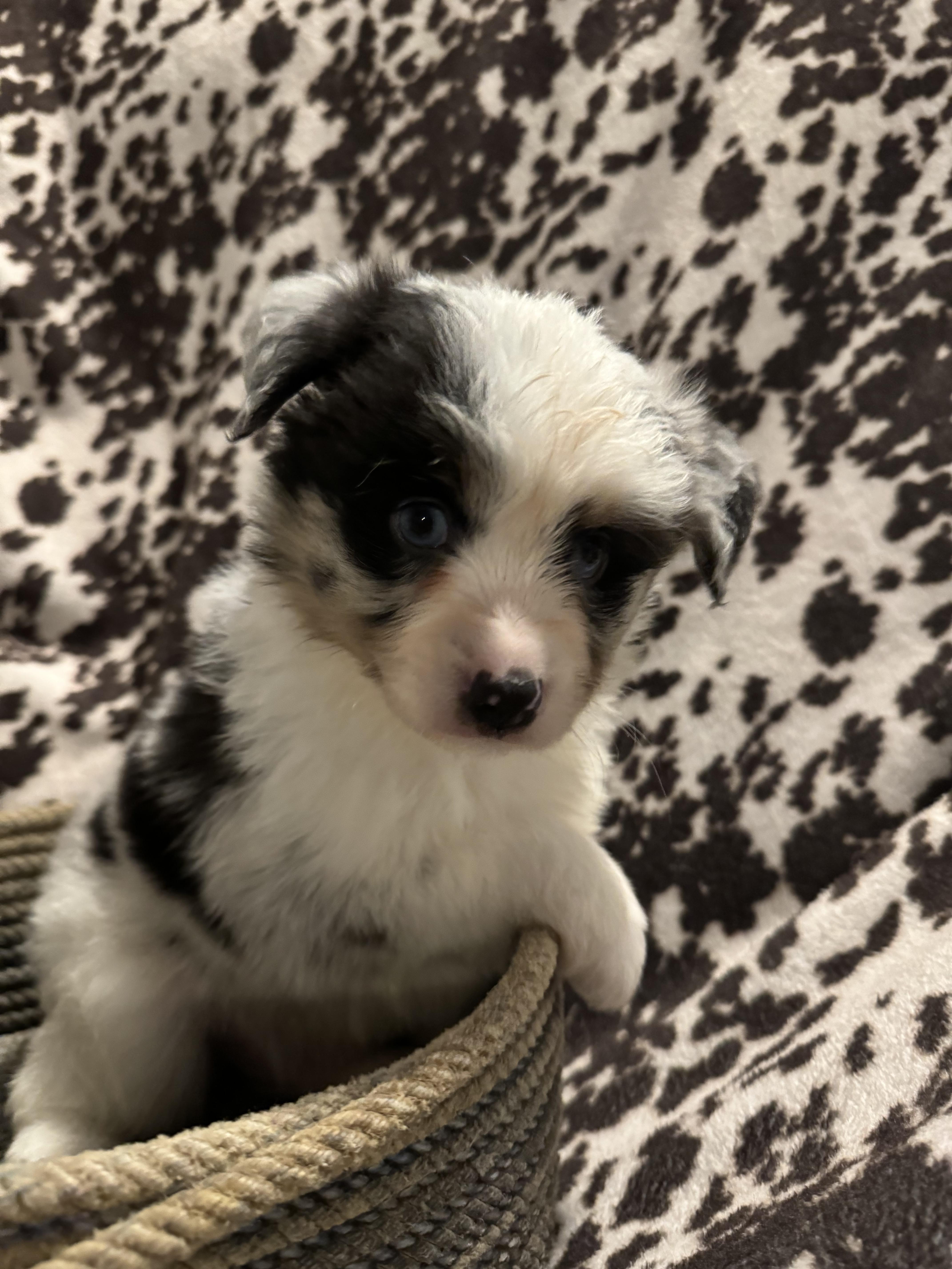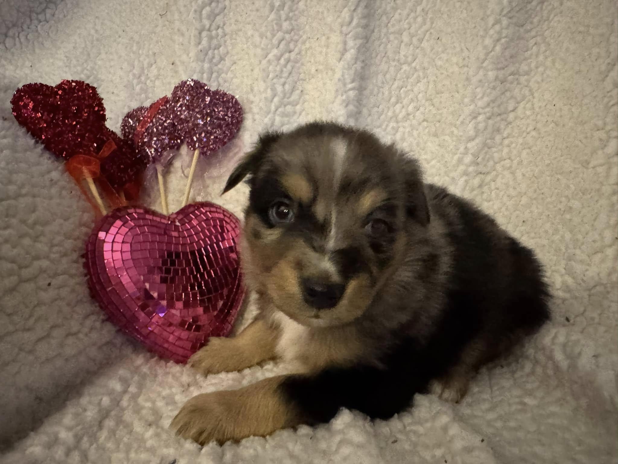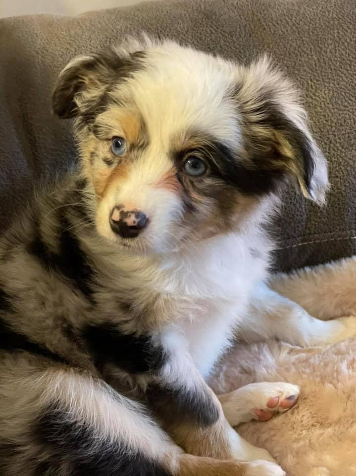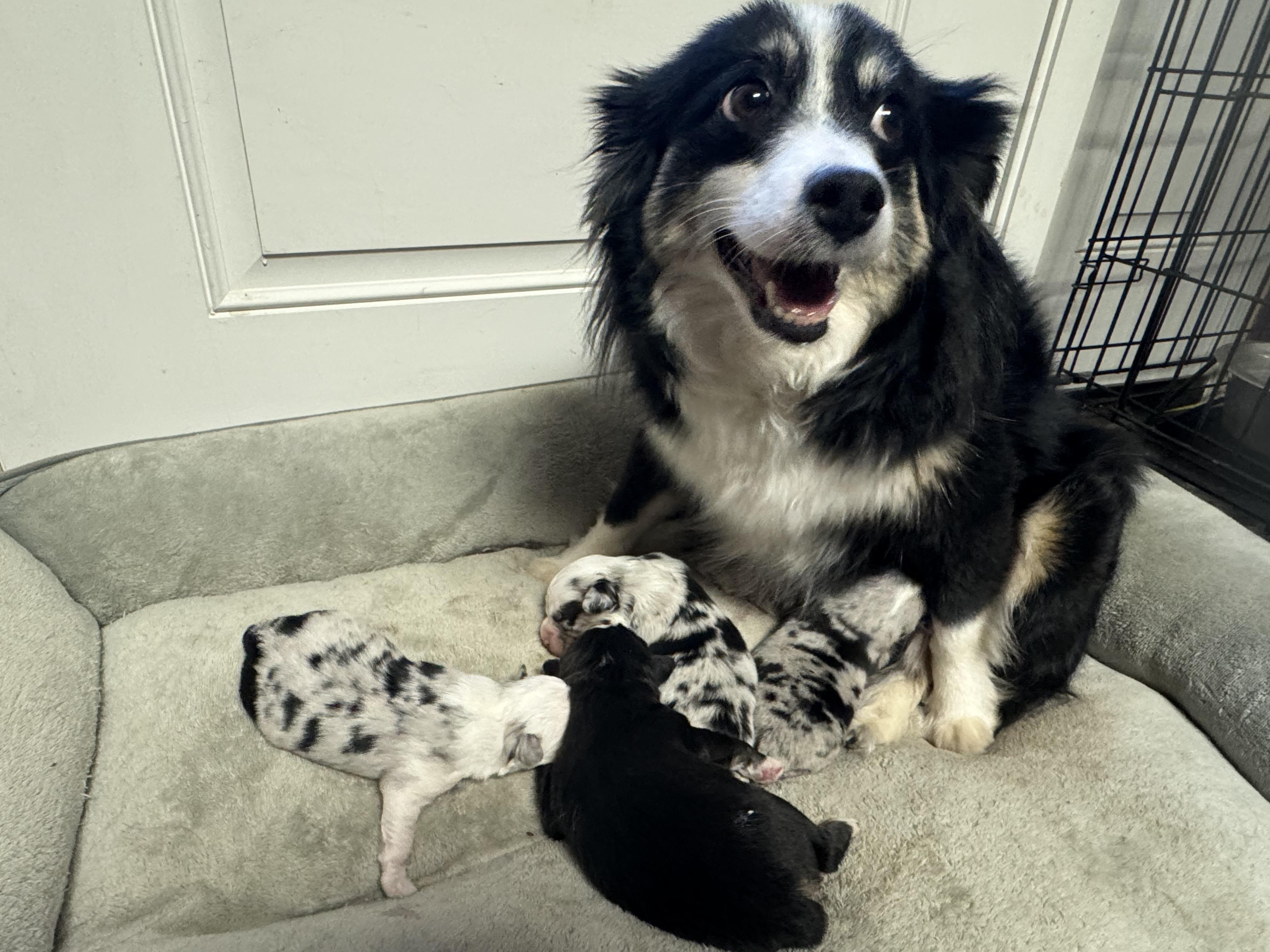 Our puppies include black tri, blue merle, red merle, and red tri. Colors will vary depending on the parent dogs.