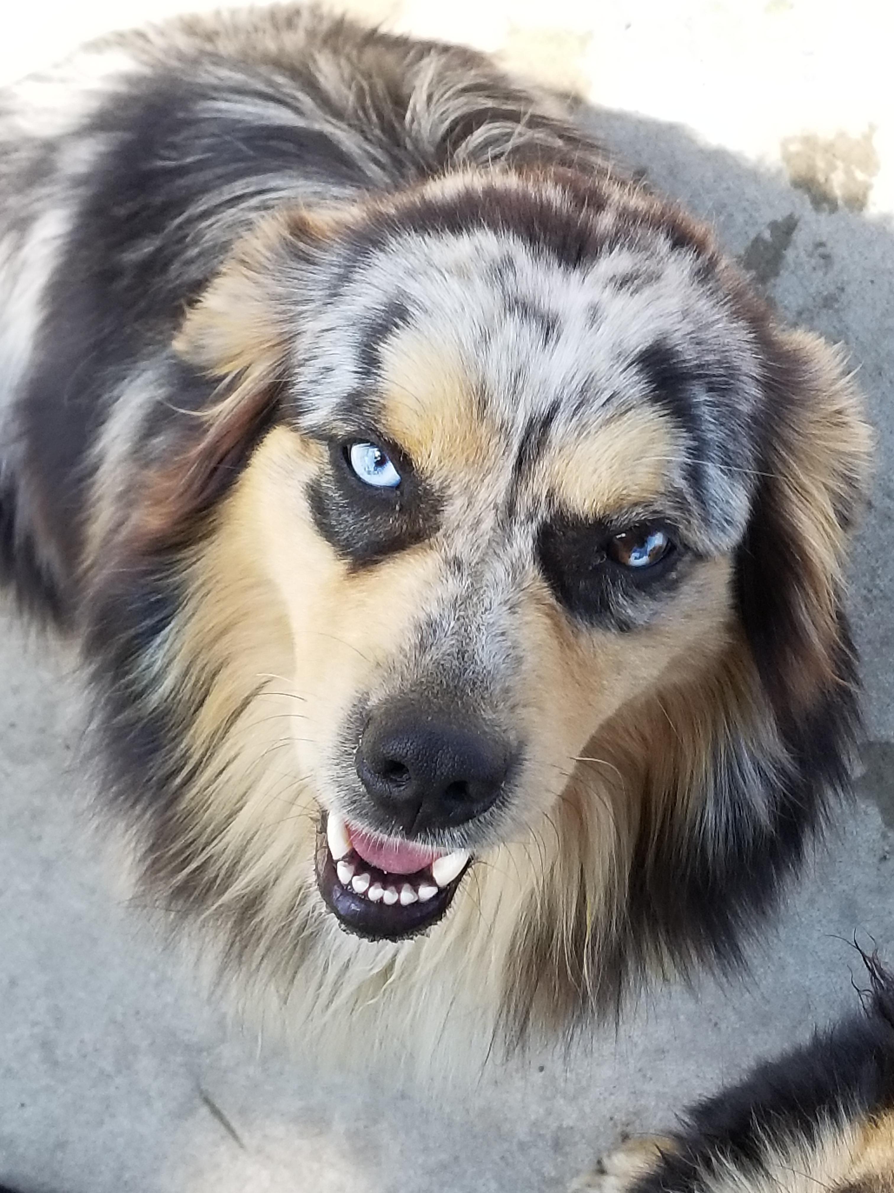 Large mini aussie with one blue, and marbled blue and brown eye. He is a Blue Merle