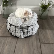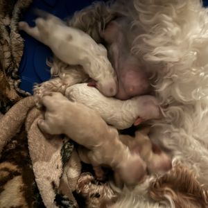 Puppies are 7 weeks today and just had their first set of shots. Cletus (white/tan)is still available and is saying bye to his sister Winnie today as she’s going home with her new family. Rosie goes home next Friday.