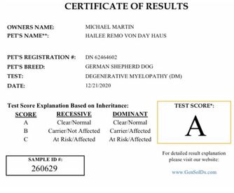 5 Star German Shepherds aka Martin Family German Shepherds reports to performing the health tests below on their breeding dogs. Ask your breeder about the tests performed on the parents of your litter. Learn more about health testing for German Shepherds.