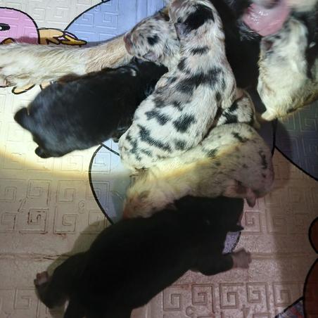 They're here!! Dolly woke me up around 230am and we went to her delivery area. 🥰 (5 blue merle, 3 blk tri) More details to come!!