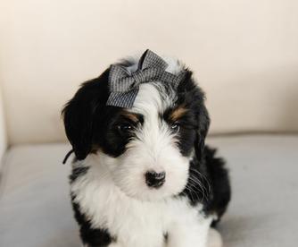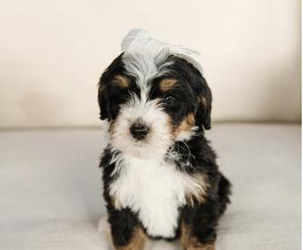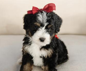 Our Bernese Mountain Dog puppies are black rust and white. Bernedoodle puppies are tri-color. Colors will vary depending on the parent dogs.