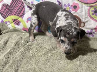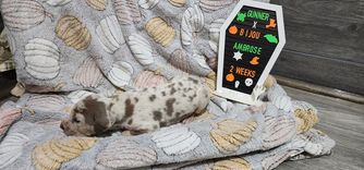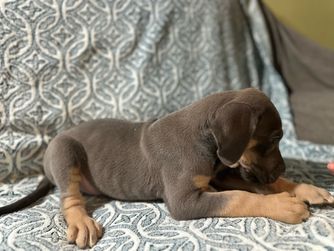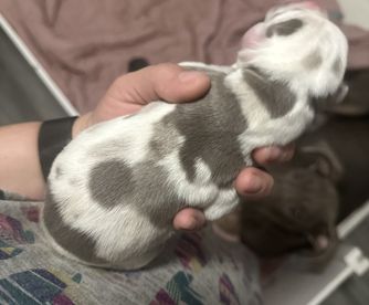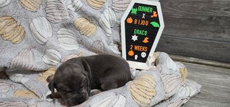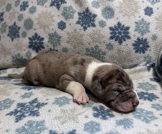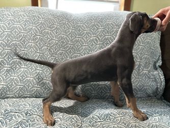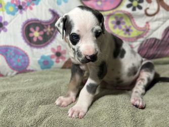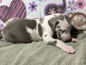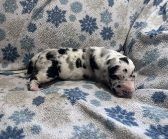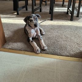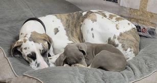 I'm Eleesha L., the breeder behind A Spot Of Blue Great Danes located in Horicon, WI. We breed for health and temperament in our Danes, and we have made changes over the years in our dogs to accommodate this. While we currently have heart and hips tested, we are looking to add thyroid, eyes, and patella as well starting 2024. Lovingly raised in home with us and our family.