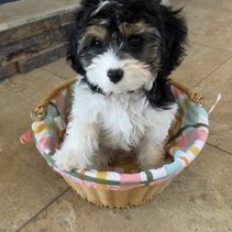 Cavapoo puppies include blenheim and tri-color. Goldendoodle puppies include cream and red. Bernedoodle puppies are tri-color. Colors will vary depending on the parent dogs.