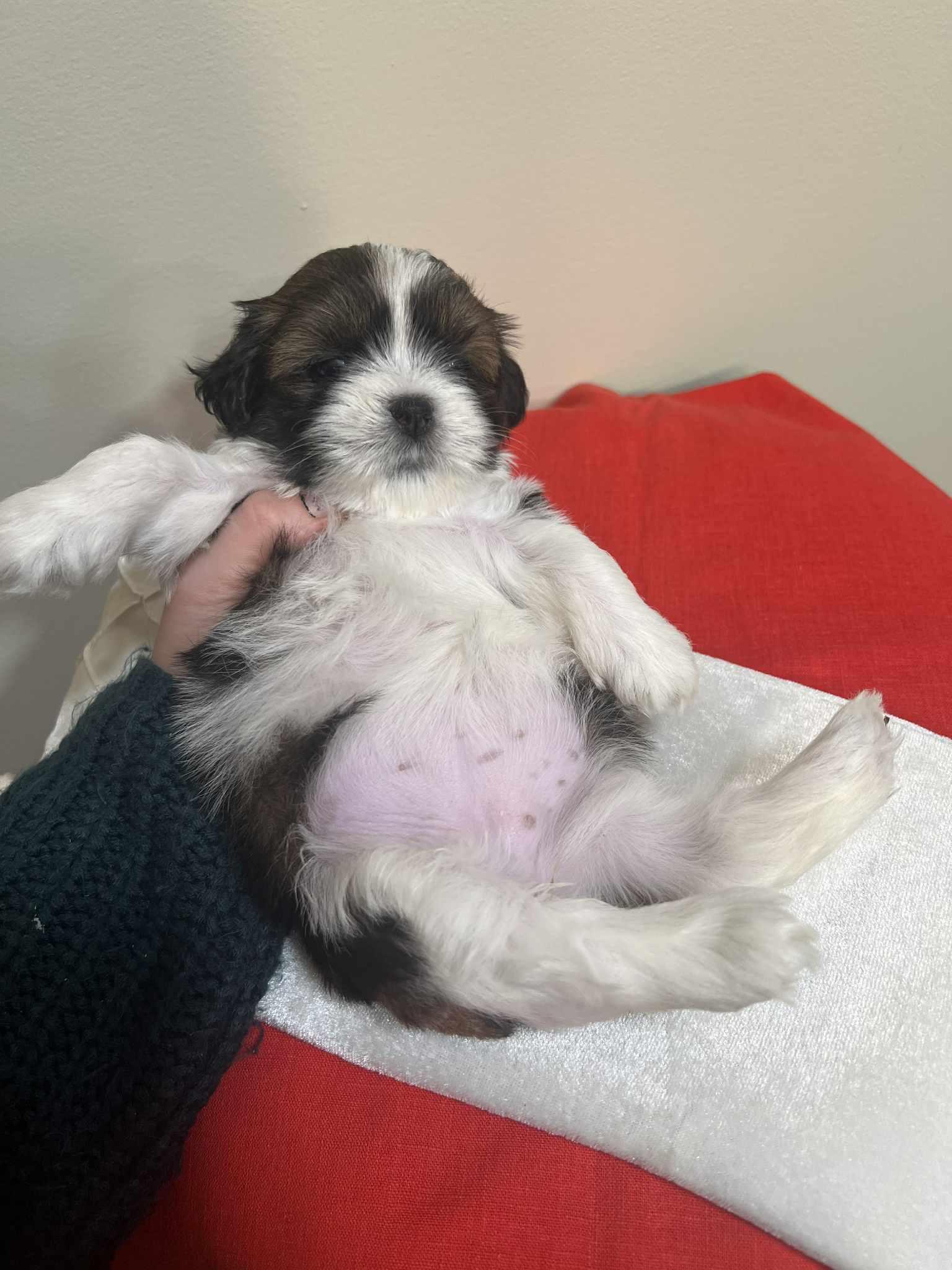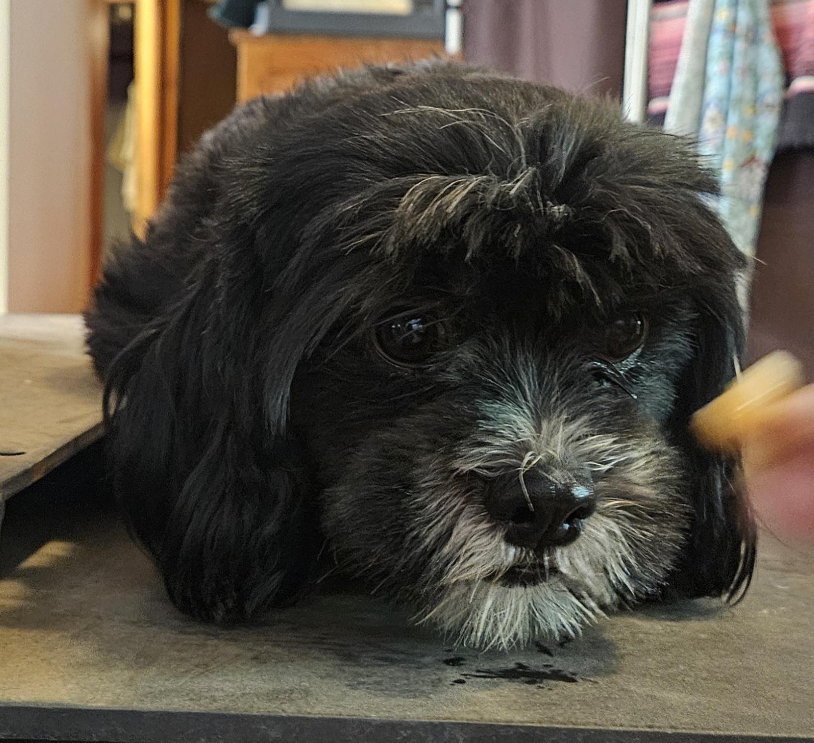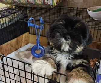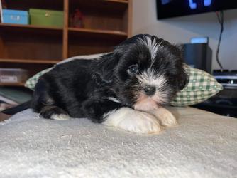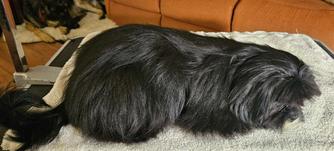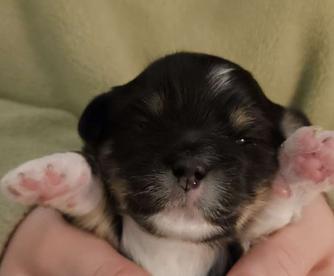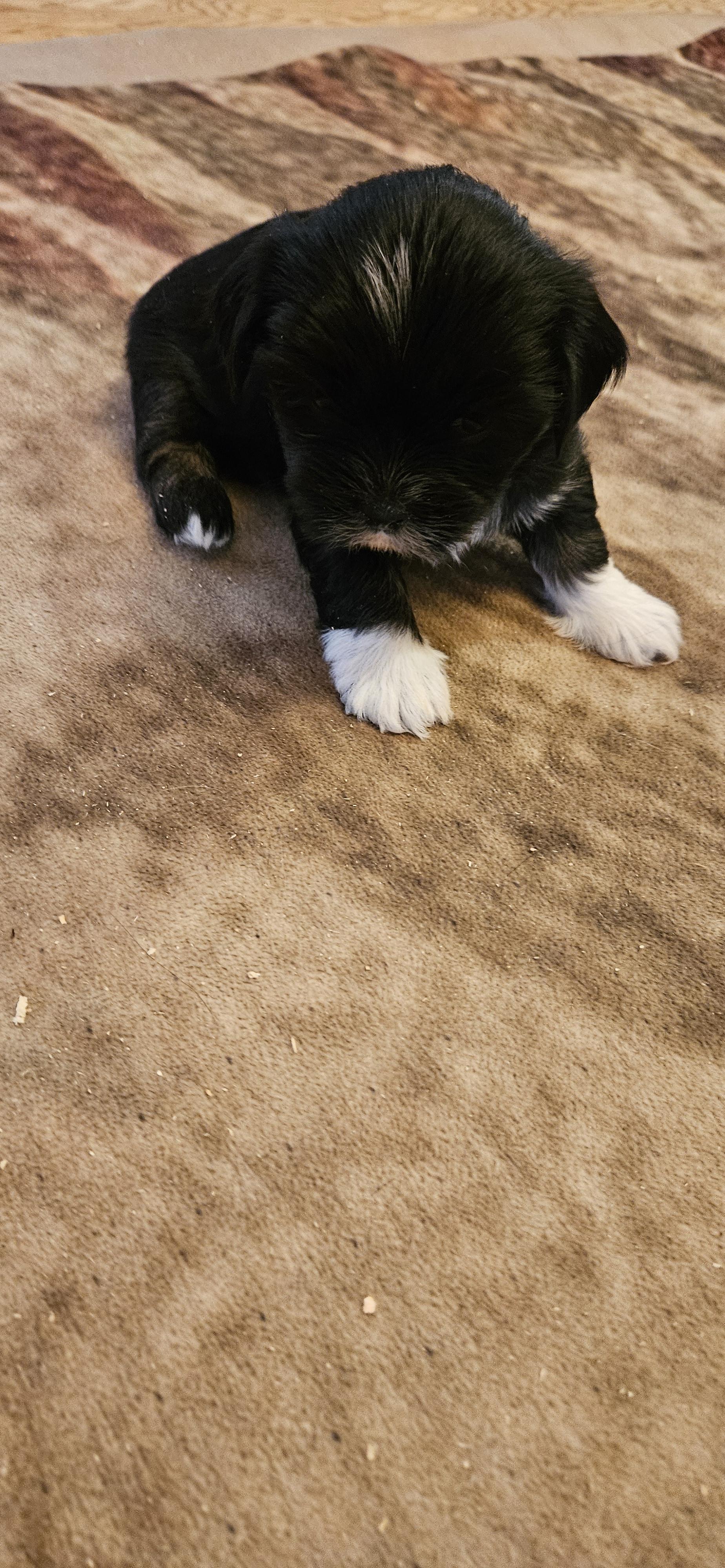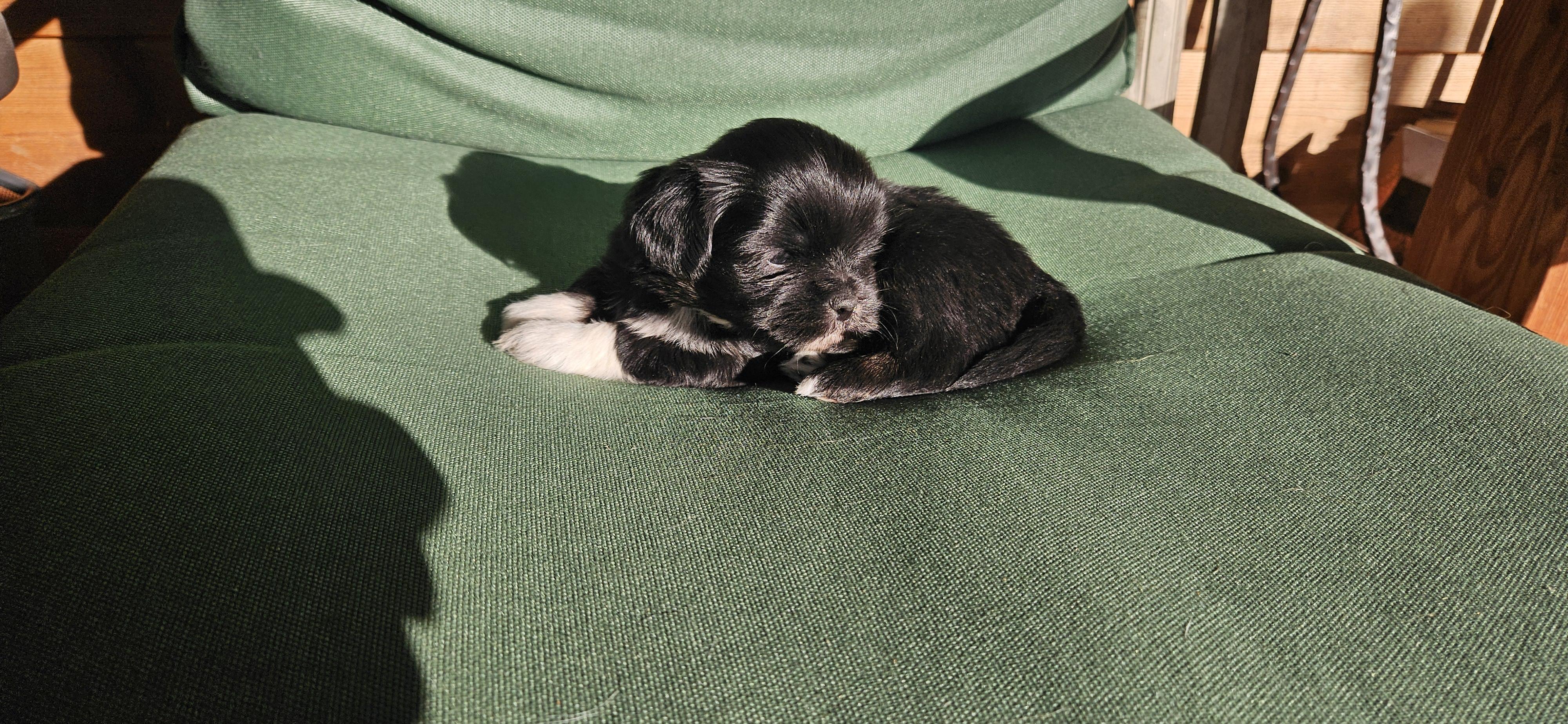 MelloW is a lovable, outgoing and easygoing little boy. He is excellent with the girls, easy to groom and loves his toys. Mellow will play with his toys independently as well as with one of us. He is a healthy eater and carries a magnificent coat. He is from a long line of excellent dogs with champions in his background. He is primarily black with white markings.
