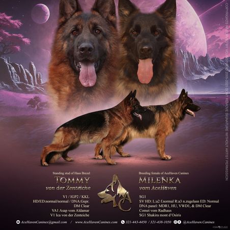 I'm Ashly Caballero &., the breeder behind AceHaven Canines located in Orlando, FL. We Produce Red and Black - Short, Plush & Long Coat - West German Showline - German Shepherds of World Champion Bloodlines. Each parent having over 30+ Champions in their 5 generation pedigree. All of our dogs are health tested for hip & elbow dysplasia and DM. Breeding German Shepherds to the highest quality is extremely important to us. We strive to achieve the highest potential for every dog. We focus on health, temperament, structure, and beauty.