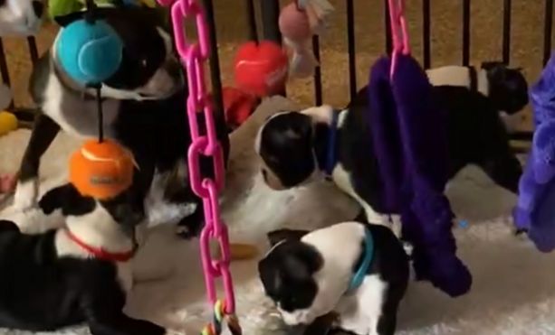 Our puppies include brindle and white, black brindle and white, and black and white. Colors will vary depending on the parent dogs.