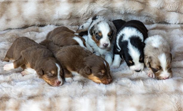 Our puppies include red merle, blue merle, black tri-color, and red tri-color. Colors will vary depending on the parent dogs.