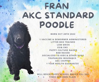 “The price includes AKC paperwork for our poodles, microchips, first set vaccination, de-worming medication, early puppy training and 2 year health guarantee. The deposit is to assure you are serious about the purchase of the puppy. This will put you in line when it's time to choose a puppy. We do not accept deposits until there is a litter on the ground.”