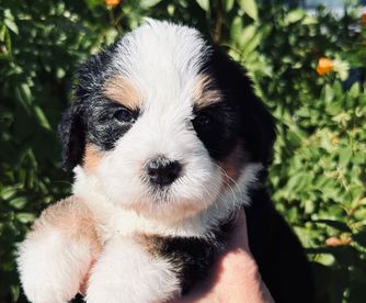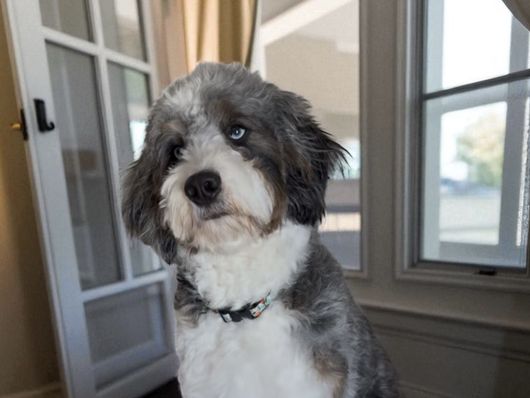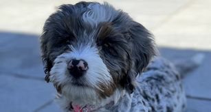 Chloe is a beautiful Mini Bernedoodle that has a beautiful Merle coat. She is sweet and loves other animals. Chloe enjoys playing at the park and going for walks in the neighborhood. Her favorite treat is peanut butter and she always does a little dance when it's time for a snack. Chloe is a beloved member of the family and brings so much joy and love to everyone around her. She is truly a special pup with a heart of gold.