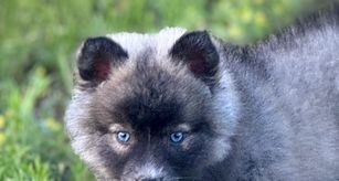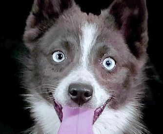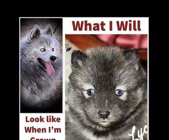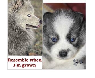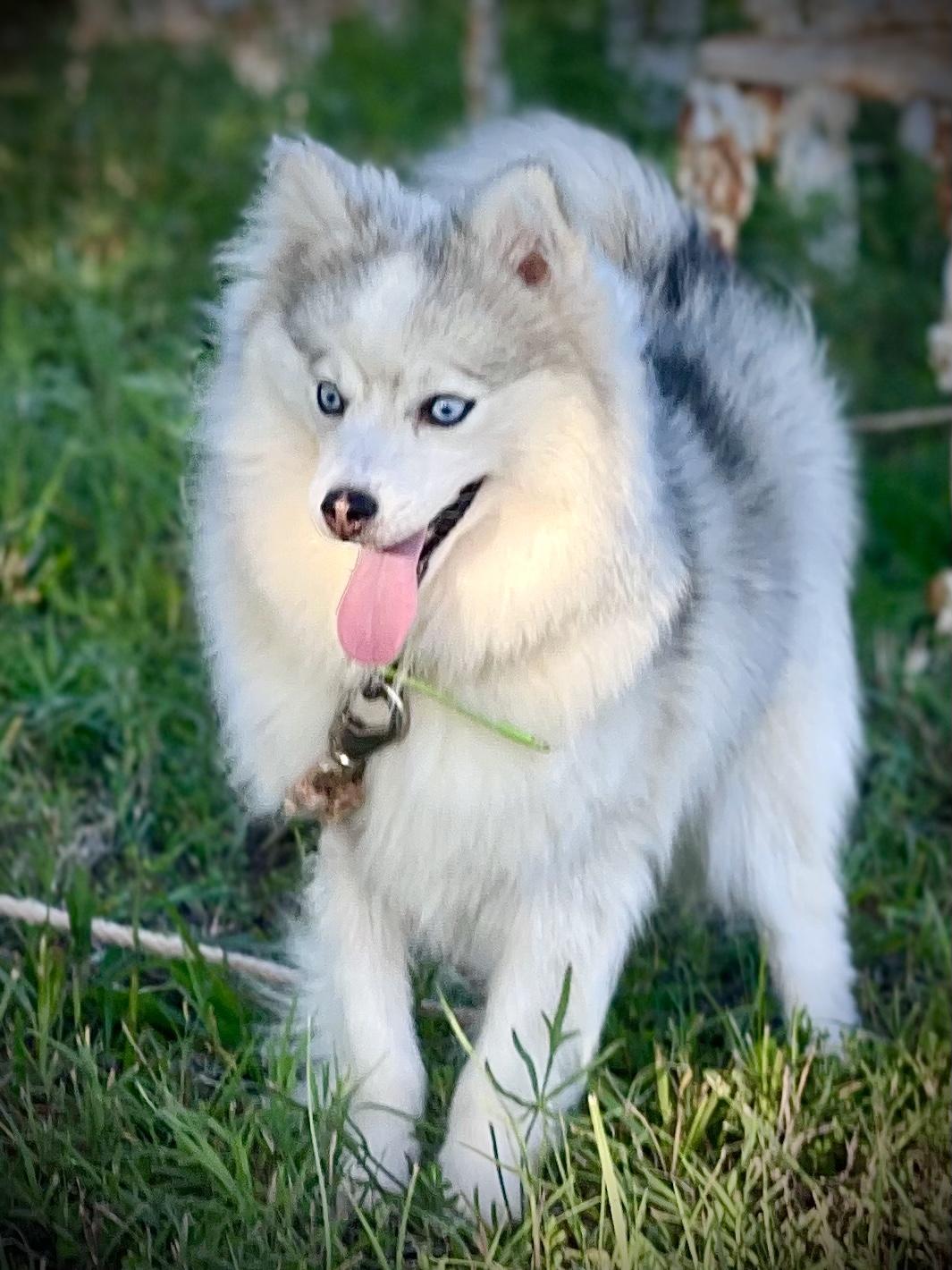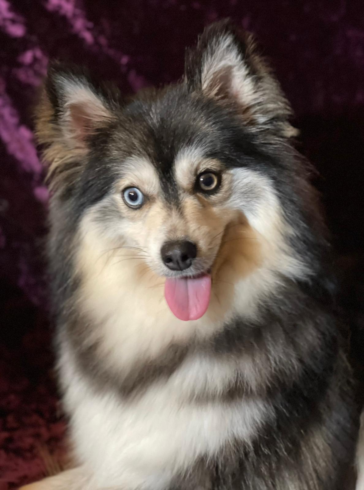 Spookie was born late one Halloween night. She is a special beautiful wolf grey toy girl weighing just 9.5lbs. She is a genius. We all agree we do not believe we have ever had a smarter dog. She has a mid length wooly coat that is luxuriously soft to the touch. She loves her pets and treats and to go for long walks outside. She also loves to sleep in our bed lol. She’s a great mom and an adorable Pomsky girl. We are very proud of our little Spookie girl.