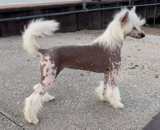 Dolly is absolutely stunning. She has a commanding yet feminine build. Athletic and graceful, Dolly moves with confidence. Dolly is as sweet as a Chinese Crested can be. She passes her beautiful show-stopping conformation and people-pleasing personality to her pups. Dolly is a VHH (Very Hairy Hairless) with patches of hairless coat on the sides of her belly and a thin coat(with no under coat) on her back and upper legs. Dolly has ample head, foot, and tail furnishings.