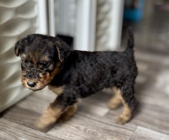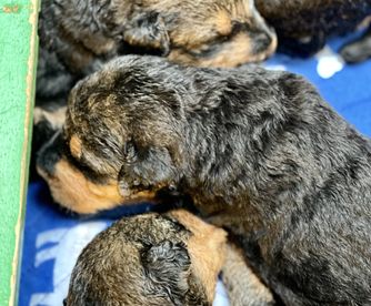Airedale Terrier puppies are black and tan. Colors will vary depending on the parent dogs.