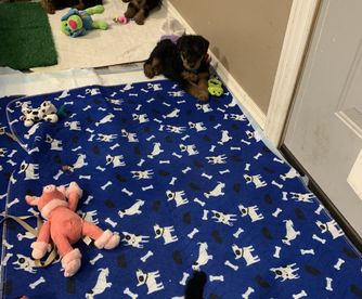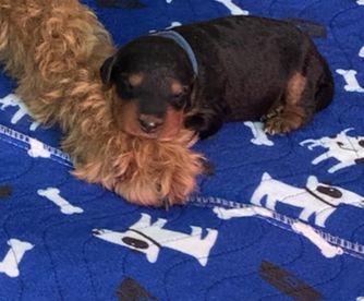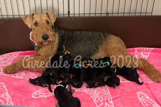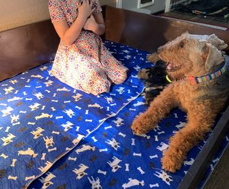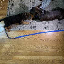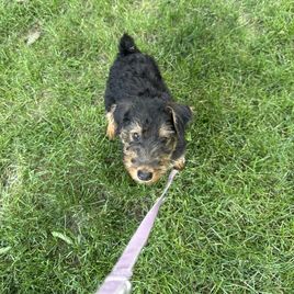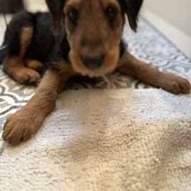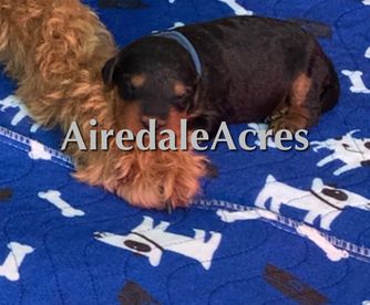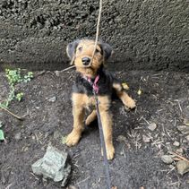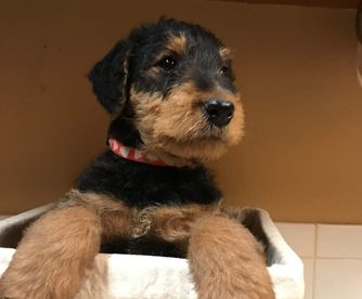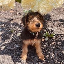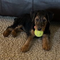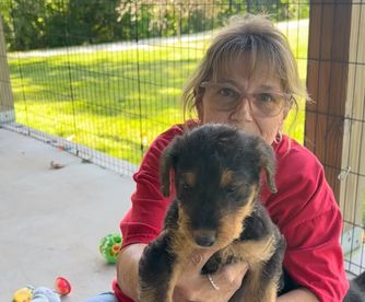 I interviewed several breeders before going with Tina. She was just great from the start. So knowledgeable about the breed and her dogs, and it was clear she does a LOT to prepare the puppies to go into their forever homes. My pup arrived with such good temperament, not phased by any noises, fine being alone and independent, no anxiety issues, and we have been in love with the little girl ever since. Tina also handled all the logistics to fly her to us, and even sent our little girl with a crate, blanket, food, and snuggle pup—all of which adds up in cost, and I so appreciated it (she still sleeps with her snuggle pup every night, too!). I'm so glad I found Tina. It was in part thanks to the good reviews here on Good Dog that I reached out to her in the first place, so I wanted to contribute as well and say that if you are considering an Airedale pup, reach out to Tina!!