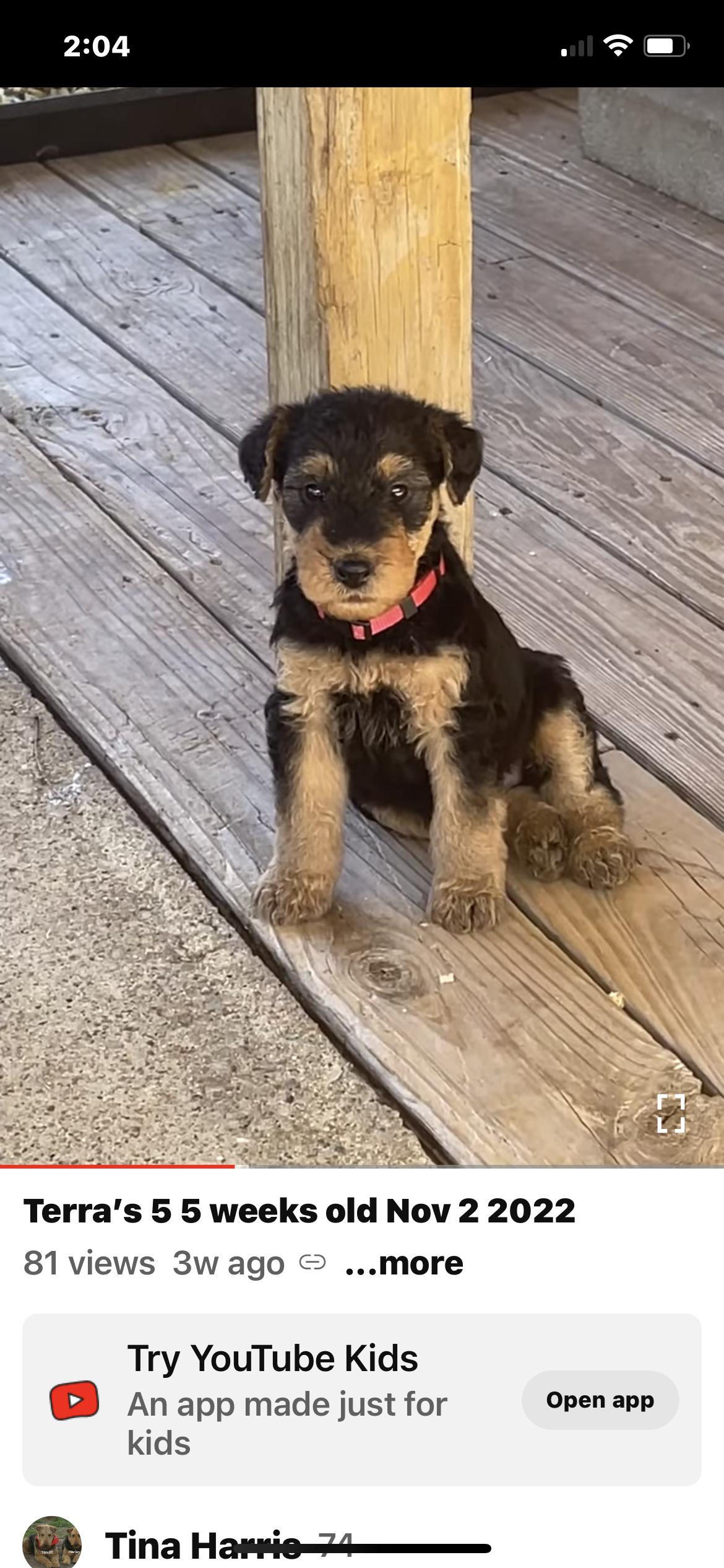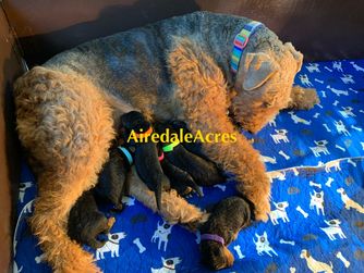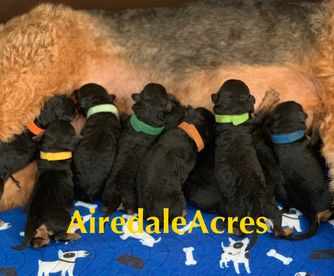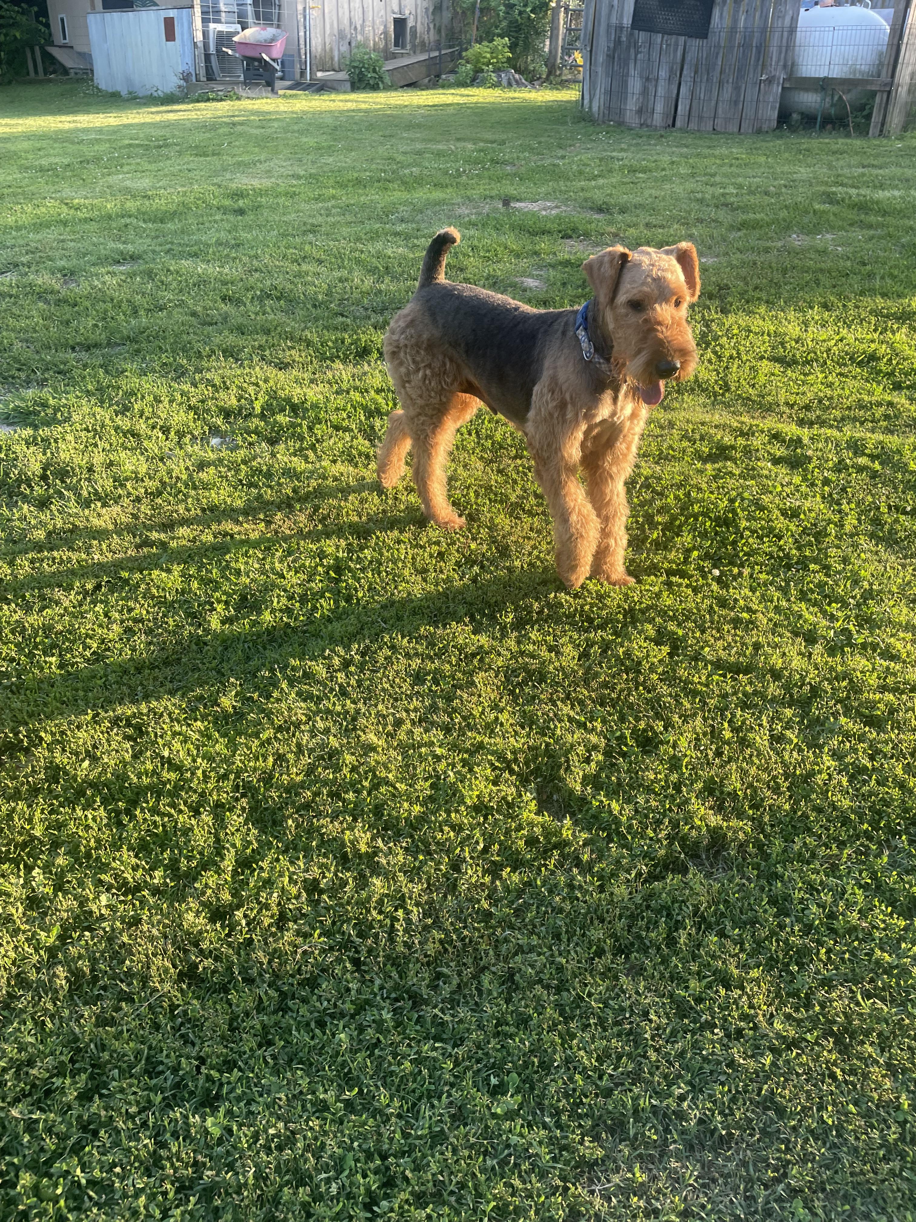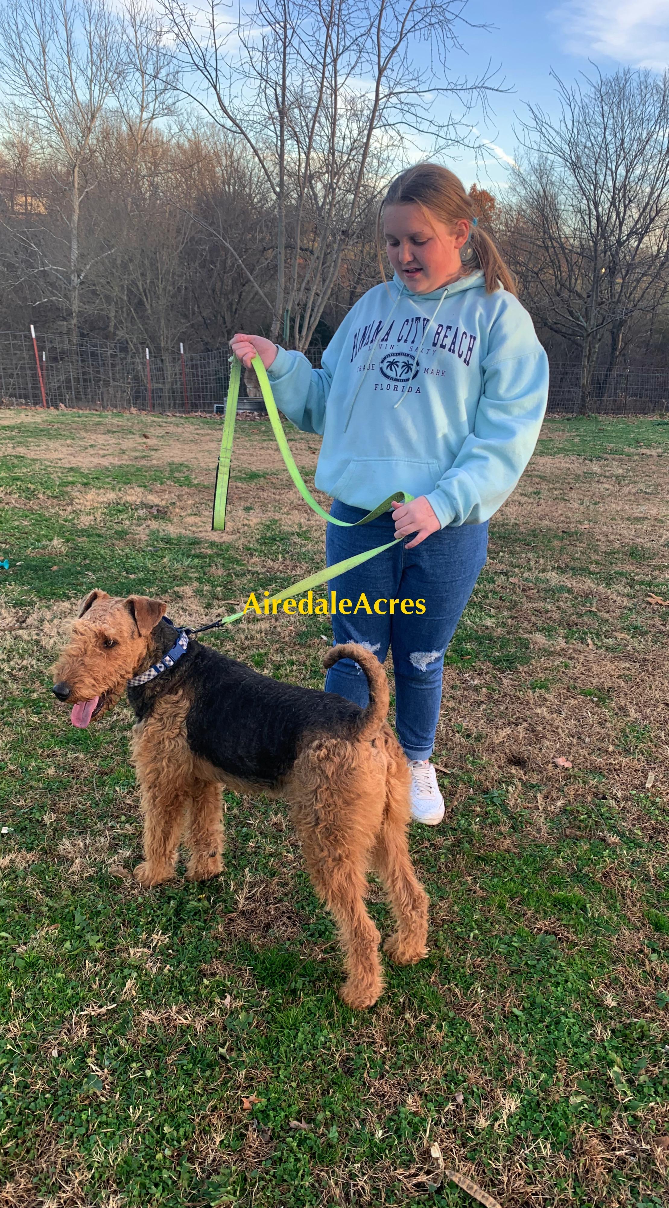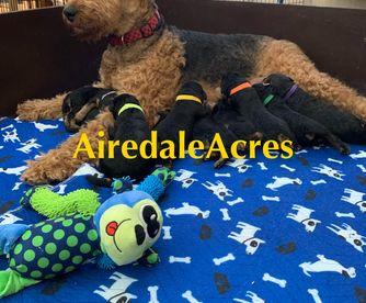 Tina has been great! We love our puppy (Gilly) and couldn’t have had a better experience with Airedale Acres. We met our Gilly’s parents, who were healthy and happy in an ideal setting. Tina spent an incredible amount of time with us orienting us to our puppy and providing everything we needed to include a toy and blanket that had her litter mates’ scent. Tina regularly checks in on Gilly and clearly loves her dogs. We couldn’t be happier with Tina and Airedale Acres.