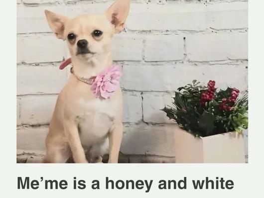 Me'me is a female Chihuahua. Carefully selected as a great representative of her breed, Mechelle decided to make her part of their program. Mechelle has passed Good Dog’s screening process, which involved a review of their breeding practices, environment, and the mental and physical health of their dogs.
