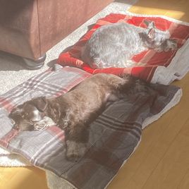 Such a sweet picture! You see sunny in the slide, poet to the right of her, then Tito, Sky and violet up front. Jasper wanted his own space and is sleeping in the corner you can’t see. Though they have 3 beds, they are often seen making a dog pile.