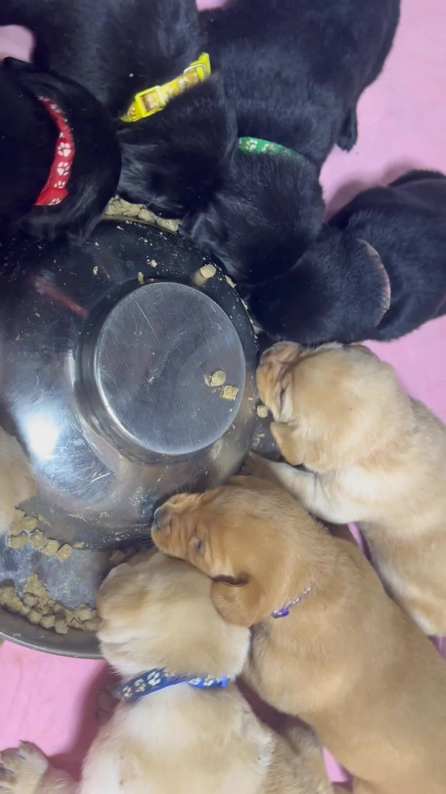 ONLY ONE YELLOW MALE & ONE BLACK FEMALE AVAILABLE! Pups had their dinner/playtime/had a good wipe down(they’re still damp in pictures) now it’s nap time in their puppy bed💛🖤 Pups are absolutely gorgeous!