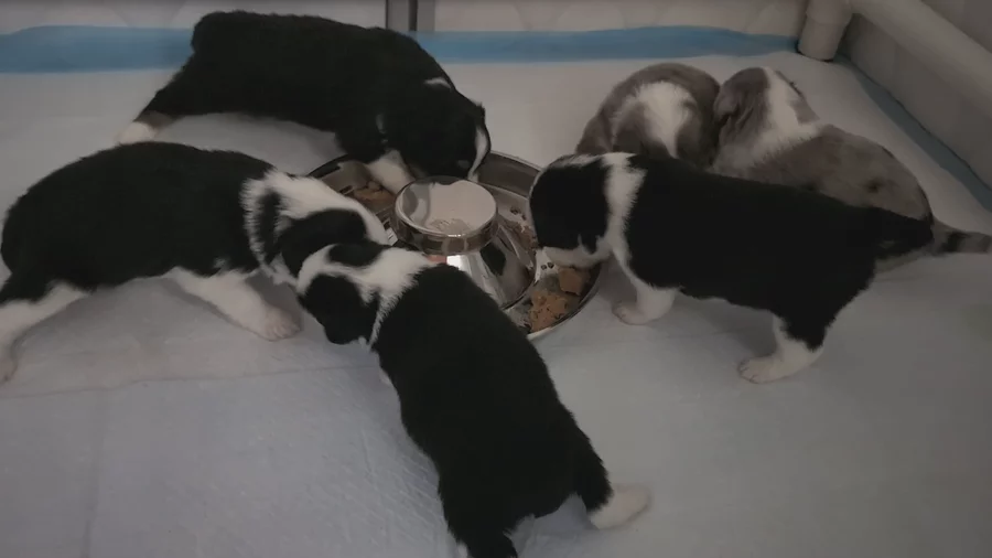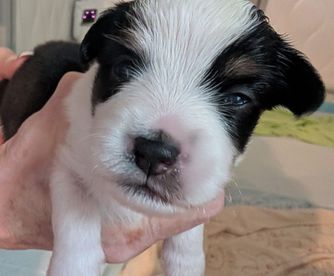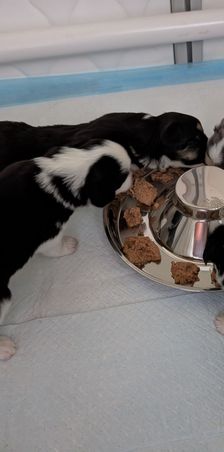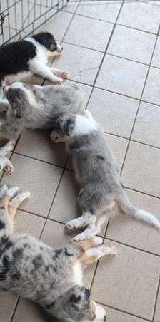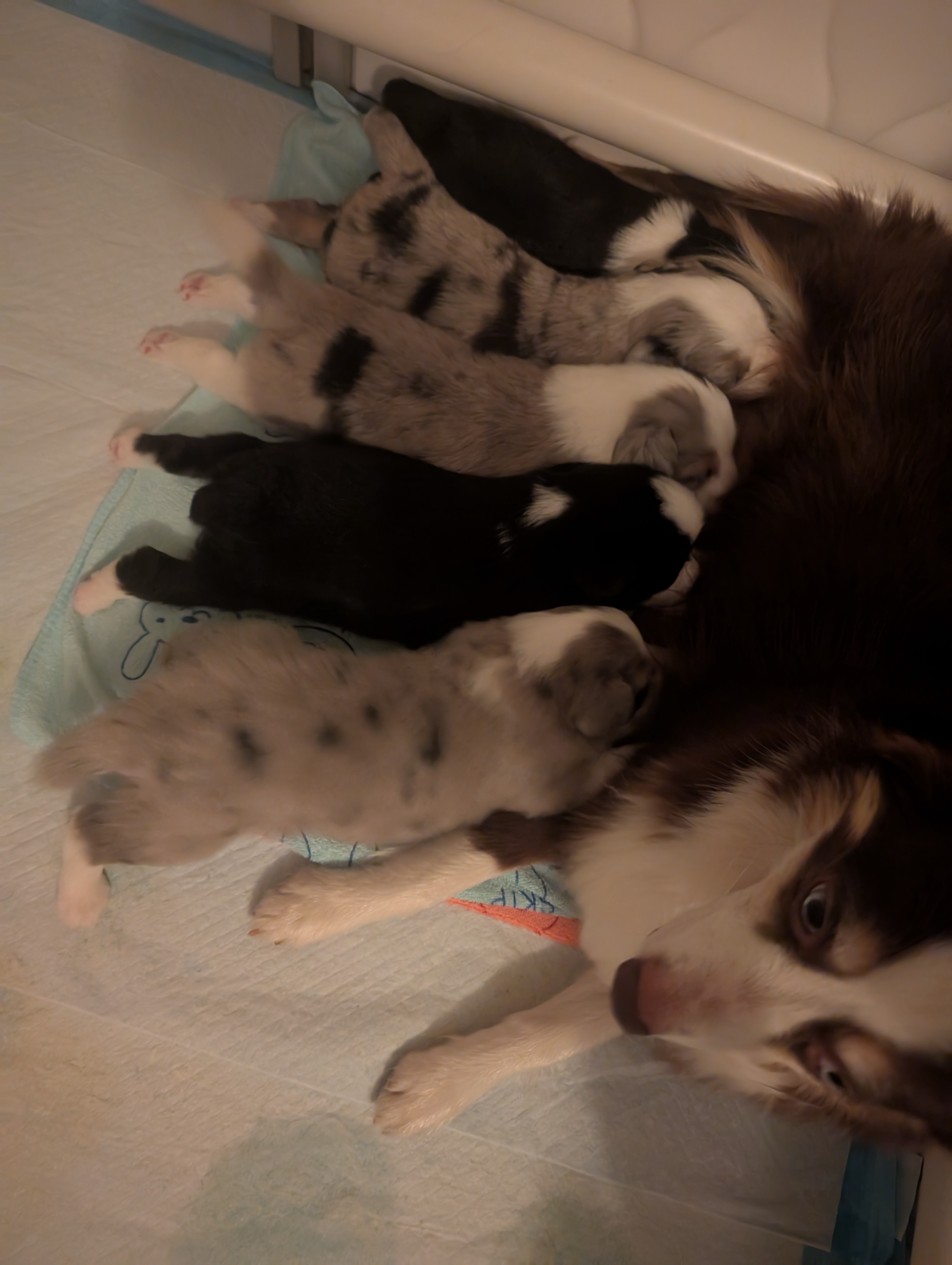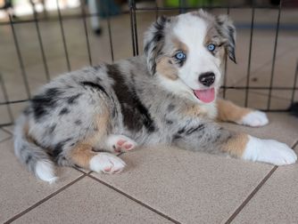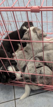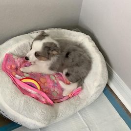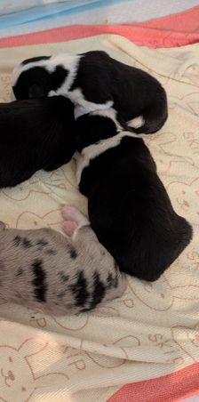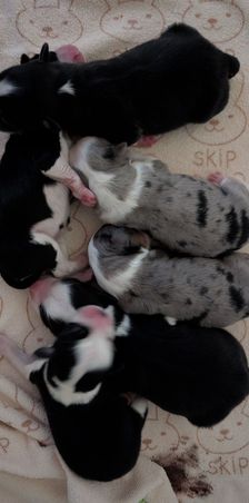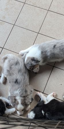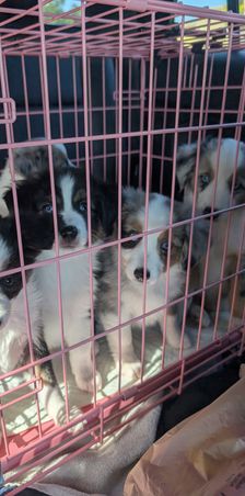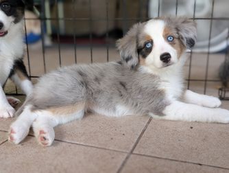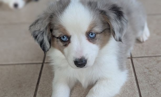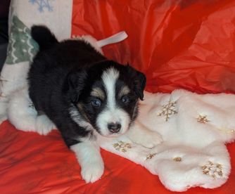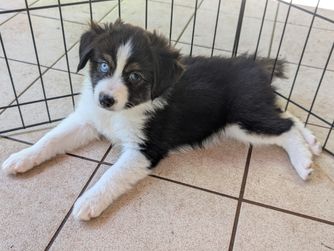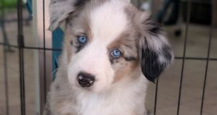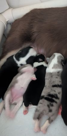 Our puppies include black tri and blue merle. Colors will vary depending on the parent dogs.