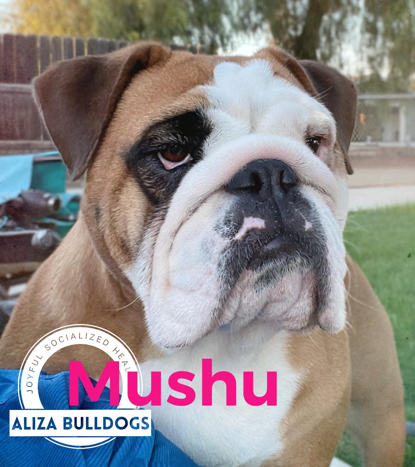 Mushu is a female Bulldog about 7 years old. Carefully selected as a great representative of her breed, Alizah decided to make her part of their program. Alizah has passed Good Dog’s screening process, which involved a review of their breeding practices, environment, and the mental and physical health of their dogs.