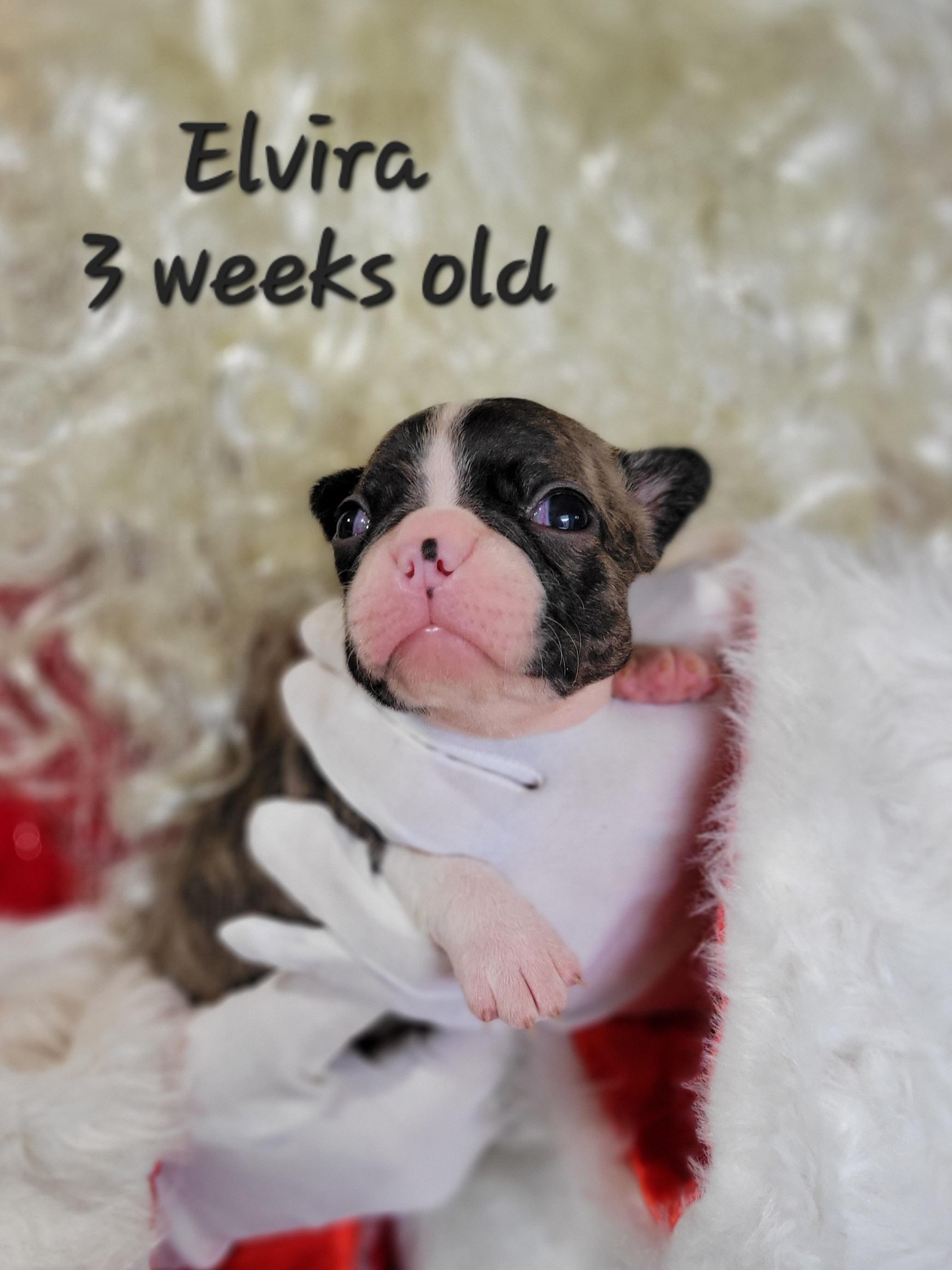 Our puppies are black brindle and white. Colors will vary depending on the parent dogs.