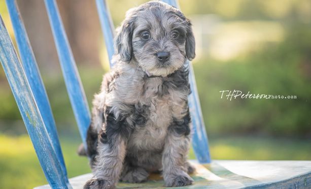 Our Goldendoodle puppies include cream, apricot, red, and merle. Aussiedoodle puppies include blue merle, black and white, and black tri-color. Colors will vary depending on the parent dogs.
