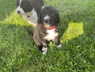 Our Bernedoodle puppies are tri-color. Labradoodle puppies are black. Colors will vary depending on the parent dogs.