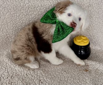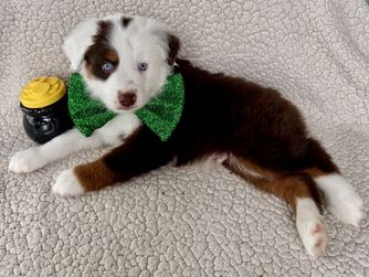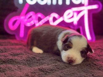 “Our Mini Aussies come with a microchip, docked tail, dew claws removed, 1 set of vaccines from a licensed vet, dewormed from 2 weeks, swag bag, litter box trained, intro to crate training and MORE!”