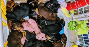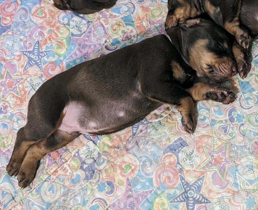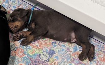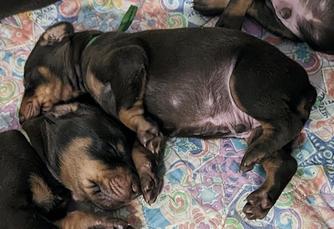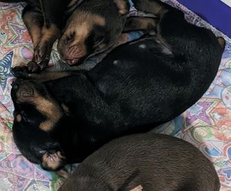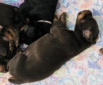 Our puppies include black and rust and red and rust. Colors will vary depending on the parent dogs.
