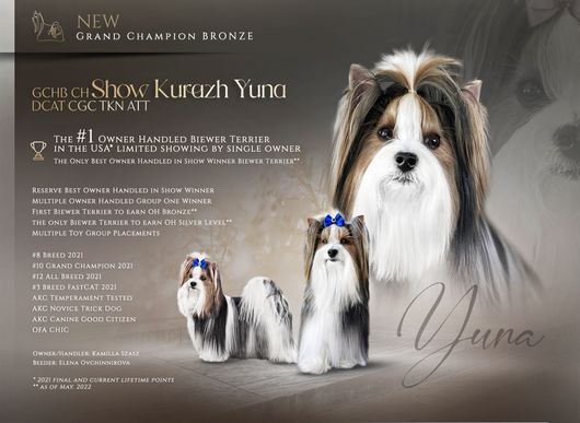 I'm Kamilla S., the breeder behind Allure Biewer Terriers located in Woodside, NY. With a relatively small breeding stock, our main goal is to breed healthy, well-adjusted puppies who are ready for the show ring and/or to be the perfect family companions, while providing superior care and individual attention to each of our dogs in a true home environment living as our pets year-round. 100% of our current breeding dogs live with us, are OFA CHIC certified, health tested beyond the required level, and all have been Championed, Grand Championed or reached the Bronze Grand Champion level. Running a small program means we only keep, show and breed our very best, and all of our puppies have titled and health tested parents. It also means that we do not have puppies available all the time. To ensure diversity we occasionally work with other breeders as well. We are active members of the Biewer Terrier Club of America - the national parent breed club. "Allure" is registered kennel name with the American Kennel Club.