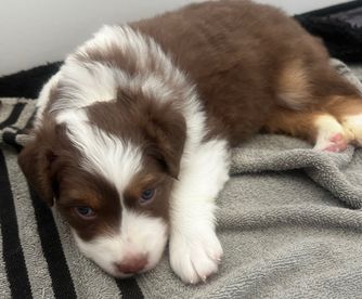 Our Australian Shepherd puppies include red merle, blue merle, black tri-color, and red tri-color. Miniature American Shepherd puppies include black tri, red tri-color, red merle, and blue merle. Colors will vary depending on the parent dogs.