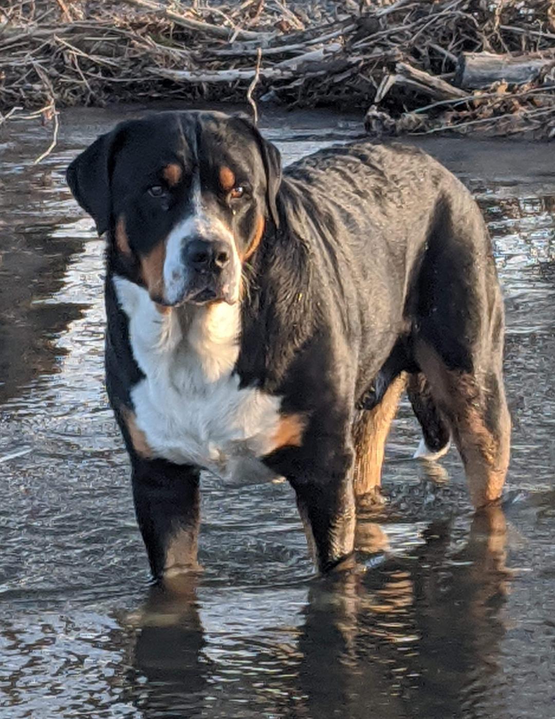 Newton is a male Greater Swiss Mountain Dog. Carefully selected as a great representative of his breed, Annika decided to make him part of their program. Annika has passed Good Dog’s screening process, which involved a review of their breeding practices, environment, and the mental and physical health of their dogs.